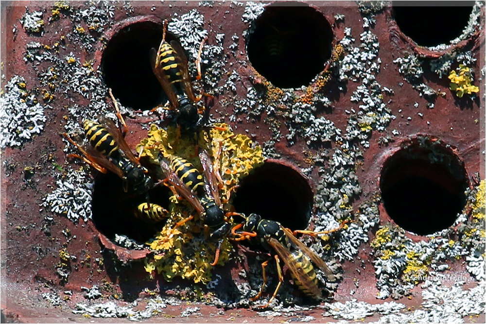 | Haus-Feldwespen (Polistes dominula) in den Lüftungsschindeln auf dem Dach. | ||