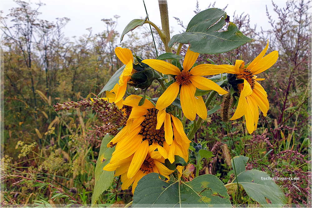 | Regentag am Freitag. Den Sonnenblumen tut es gut. | ||