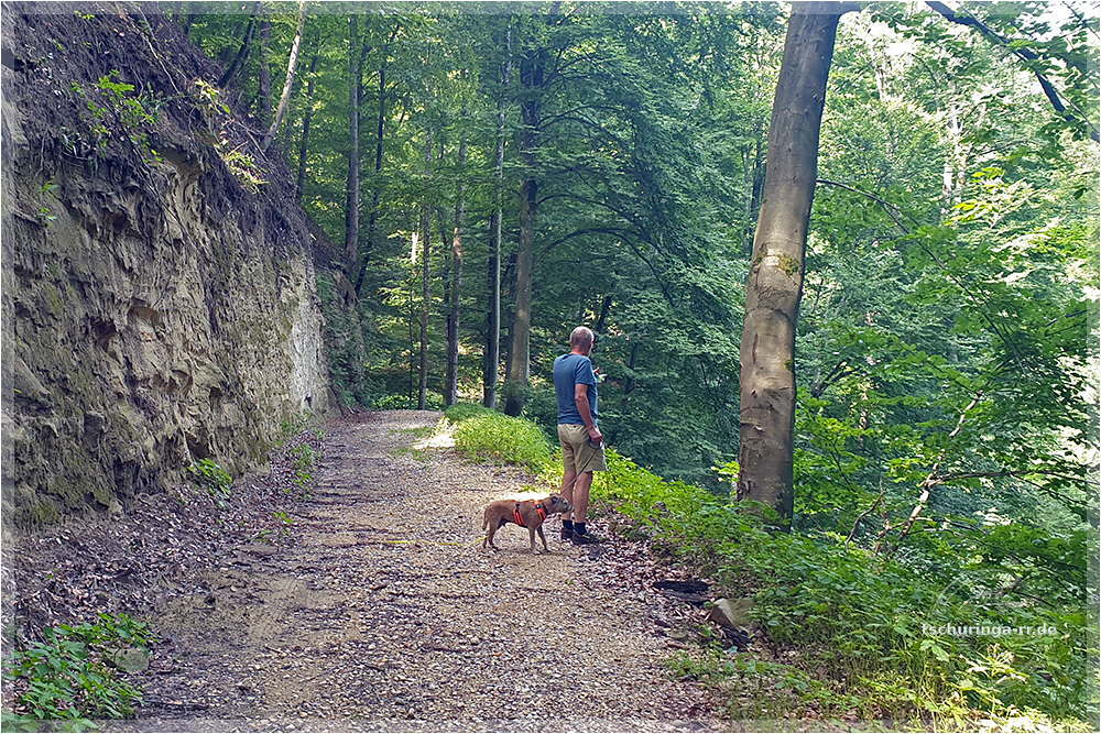 Sonntag bedeutet hier, dass was unternommen wird, wenn das Wetter mitspielt. Es verspricht wieder recht heiß zu werden. Wir fahren ins Naturschutzgebiet "Aachtobel", wo es schattige Wege und das Wasser der Aach gibt. Sehr zur Freude von Rieke und den Hunden. Es ist eine schöne Strecke, die wir laufen, auch wenn wir wieder zurück gehen, weil die 8 km Rundweg doch für Rieke recht lang wären und vermutlich ein großer Teil durch die Sonne und über Wege gehen, die für Yukon echt blöde sind. So kann der aber gut laufen und auch Rieke schafft die Strecke mit Pausen sehr gut. |
