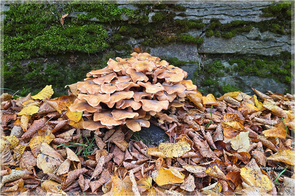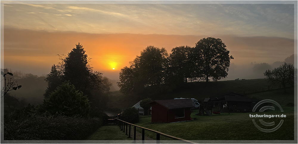 Nach dem Frühstück wandern wir auf nebeligen Wegen, über die Straße, denn die Wiesenwege sind pitschnass, hoch zur Kugelsburg. Der sich langsam lichtende Nebel ist interessant und mystisch zugleich. Käsekuchen und Kaffee gibt es im Anschluss an die Wanderung im Sonnenschein hinter dem Wohnmobil. Anderthalb Kilometer sind es zu einem Wanderparkplatz, von wo aus wir den Waldlehrpfad Steigerhütte erwandern. |