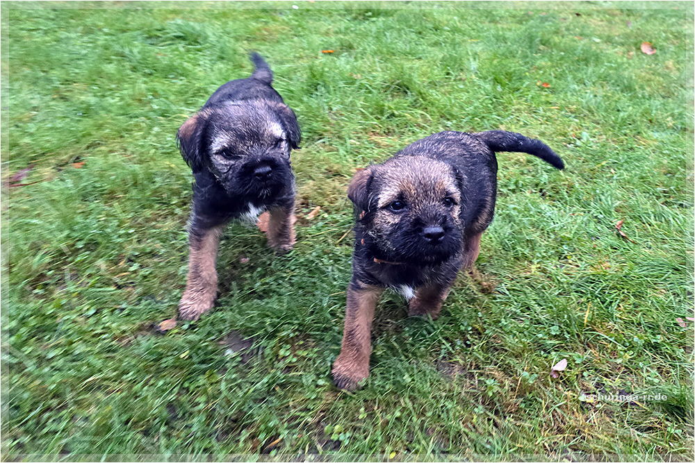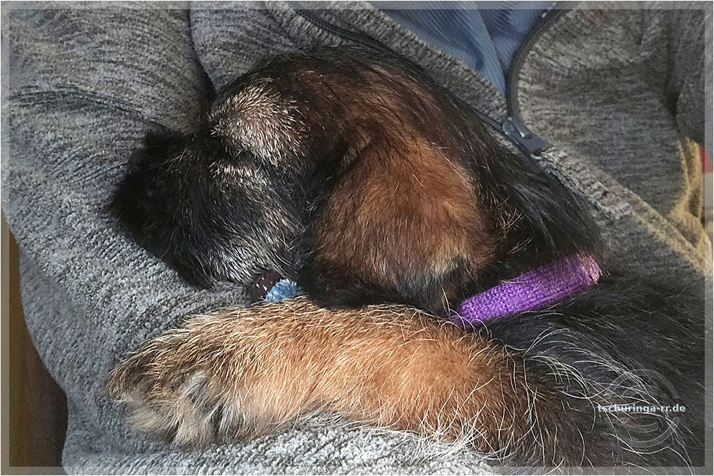 Um 6:30 Uhr hole ich Tay endgültig bei Beate ab. Um kurz nach sieben sind wir schon unterwegs. Wir kommen gut durch und mit drei Pipipausen schaffen wir es bis 15:00 Uhr nach Katzenbach. Tay hat sich super benommen. Erst auf meinem Schoß, später im Kennel und dann bei Una unten im Fußraum. Zuhause ist sie erstmal etwas unsicher, aber das legt sich schnell. Das Kleinteil ist ein recht taffes Mädel. Hier endet unsere Herbstreise rund um die beiden Würfe des Border Terrier Zwingers "Border of Dirty Devil". Ich vermute mal, dass Beate daraus auch etwas mitgenommen hat. Den Welpen ist die täglichhe rohe Mahlzeit jedenfalls gut bekommen und die zukünftigen Welpenbesitzer, die ebenfalls roh füttern möchten, haben keine Probleme mit der Umstellung. |