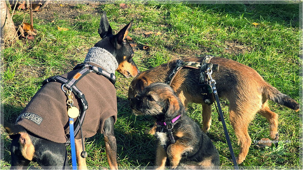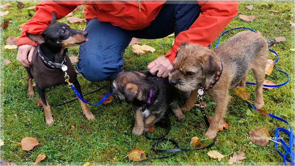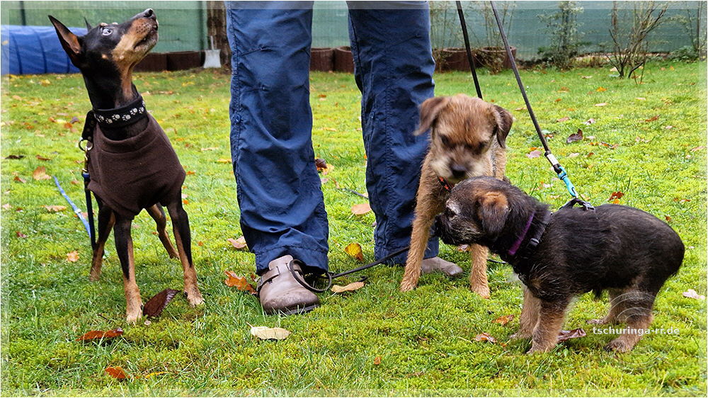 Den Morgen vertrödeln wir im Wohnmobil, weil wir auf Nachricht von Beate warten. Wenn sie Zeit hat, wollen wir eine erste Begegnung zwischen Una und Tay durchführen. Mit dem Ablauf bin ich so semi zufrieden. Una ist wahnsinnig aufgeregt und versucht Tay zu kneifen. Die quietscht erschrocken auf, ist aber nicht wirklich ängstlich. Dass es auch grantige Border gibt, muss sie erst lernen. Später kommt er mit Una rüber und wir machen einen zweiten Versuch, die beiden einander bekannt zu machen. Der verläuft erheblich besser. Das lässt hoffen. |