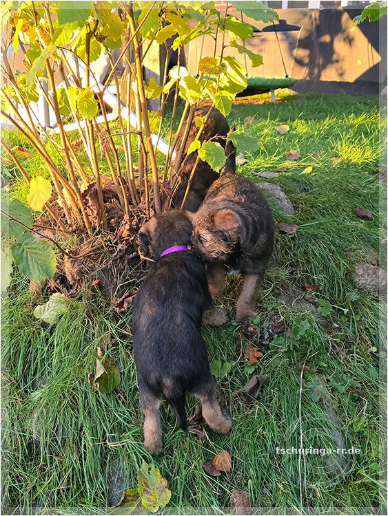 Vormittags gibt es wieder die übliche Hunderunde von ca. fünf Kilometern. Fotos gibt es keine, denn außer den fünf Rehen der letzten Tage gibt es keine interessanten Motive. Am Nachmittag ist großer Besuchstag bei den Welpen und wir haben die Gelegenheit die neuen Besitzer der beiden Schwestern von Tay kennenzulernen und die der blauen Hündin von Pia. Die Bande ist dann auch mal richtig wach und tobt draußen ganz ordentlich rum. |