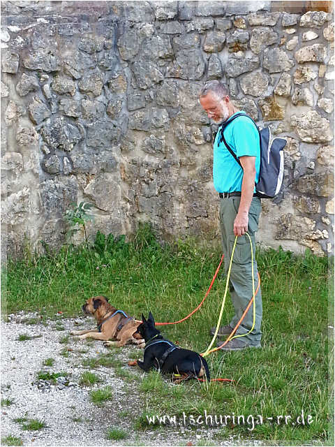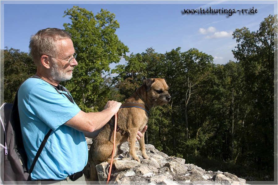 | Yukon will mal wieder über die Mauer gucken. Herrchen hält ihn kramphaft fest. Dahinter geht es etwa 15 Meter abwärts. | ||