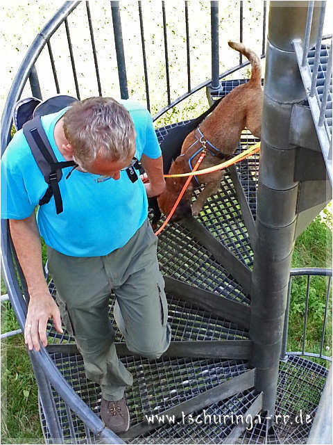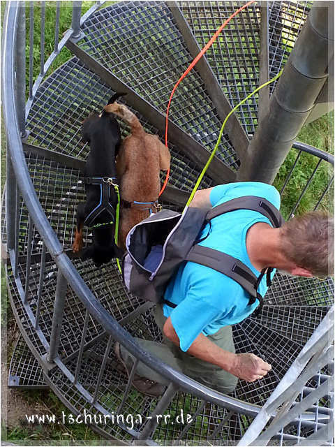 | Wendeltreppen mit Stufen aus Gitterrosten?? Kein Problem für die Jungs. | |||