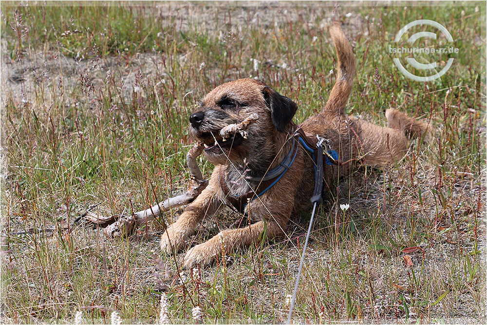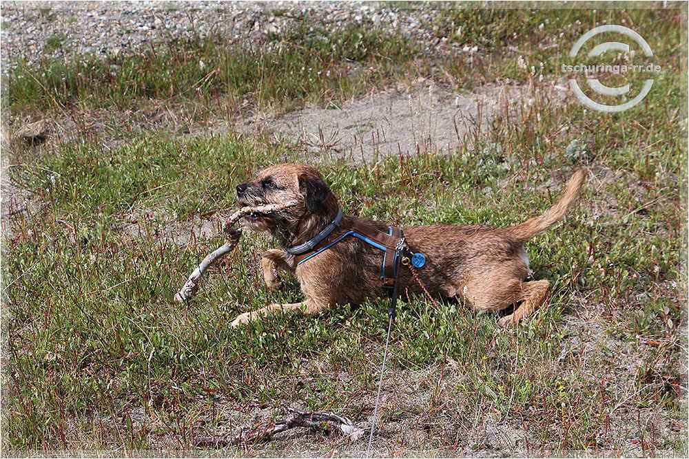 | Mit Stöckchen durch die Gegend krabbeln ist ganz nach Yukons Geschmack. | ||