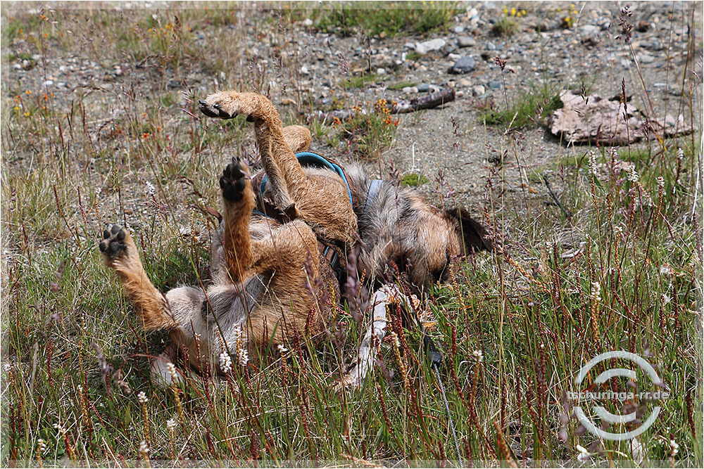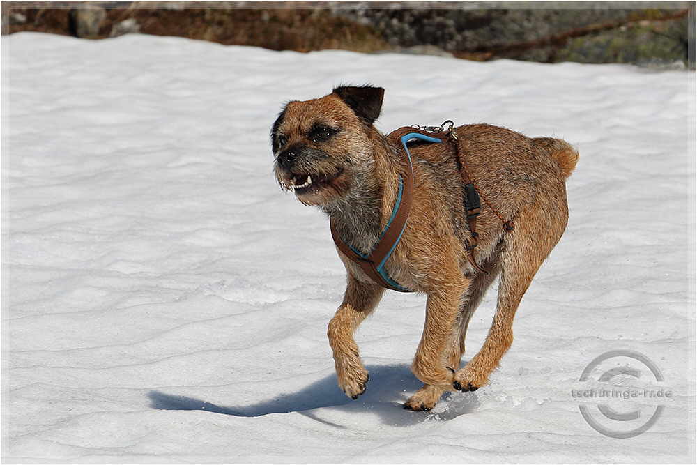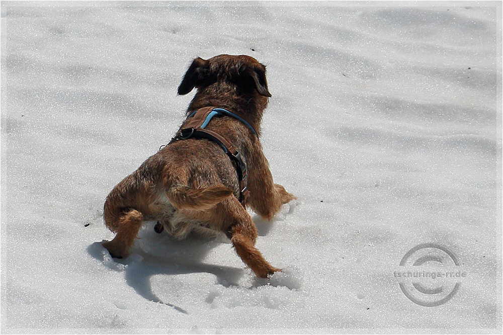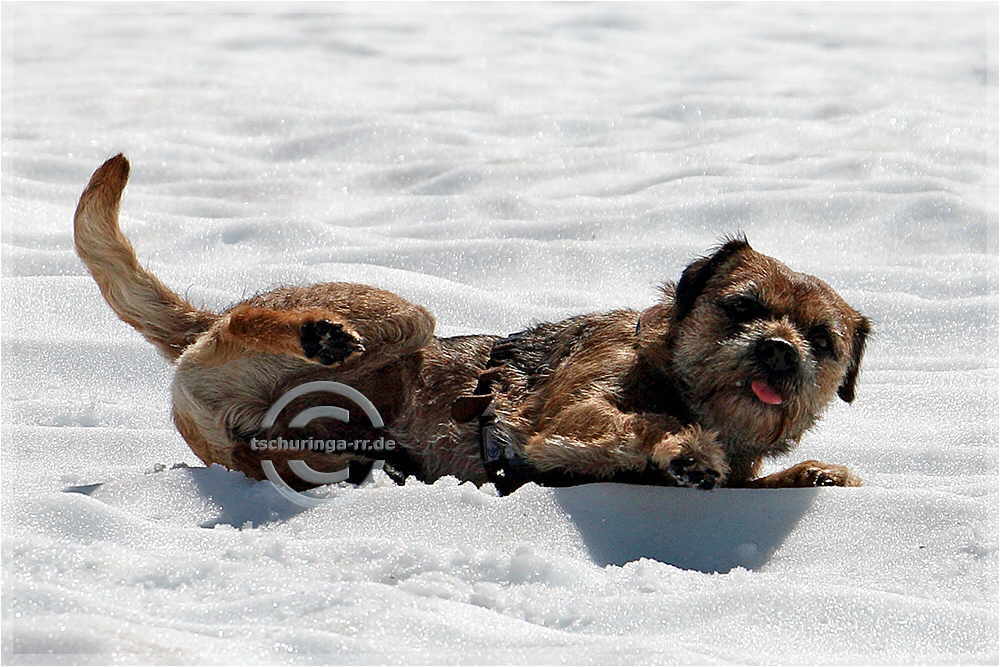 | Yukon ist begeistert. Ein Schneefeld zum Robben und Toben... | ||