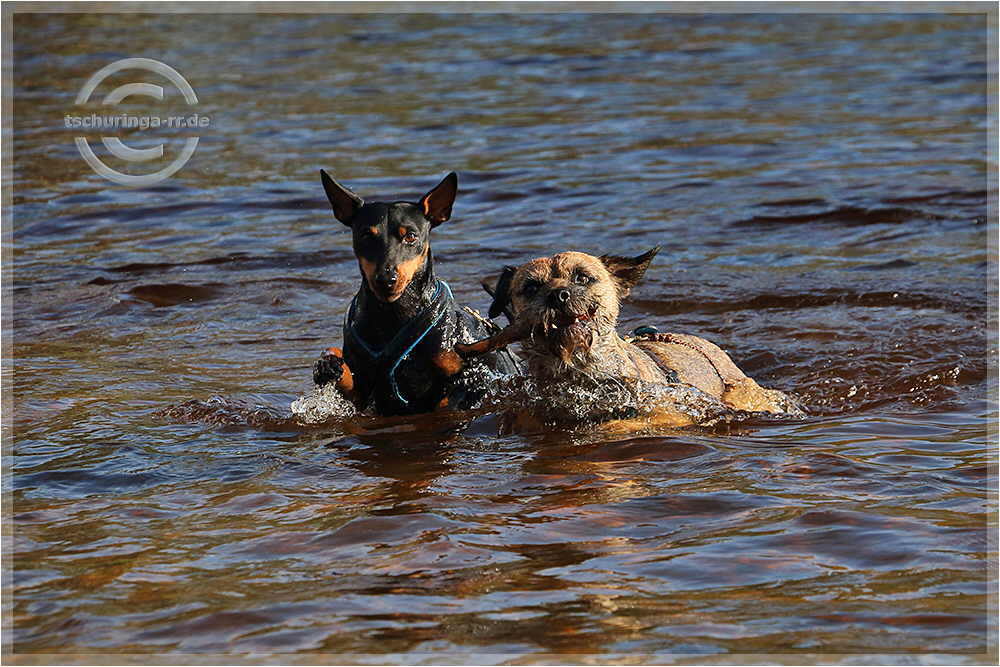 | Lennox ist sehr bemüht, dass er ohne nasse Pfoten an das Stöckchen kommt. | ||
