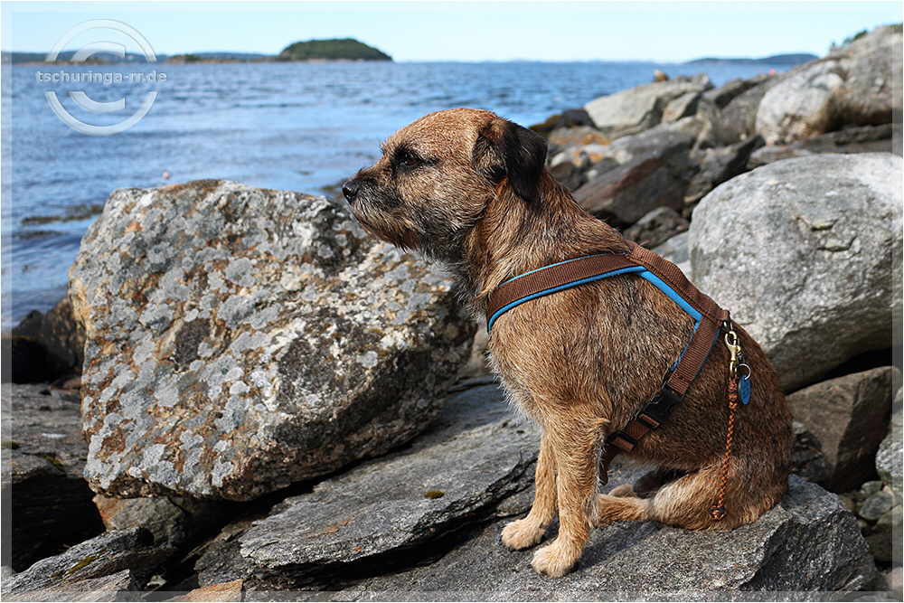 | Lennox in Geiranger. Im Hintergrund verlässt die MSC Orchestra den Hafen. | Pause mit Ausblick | ||