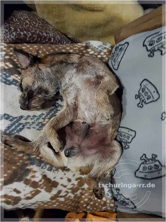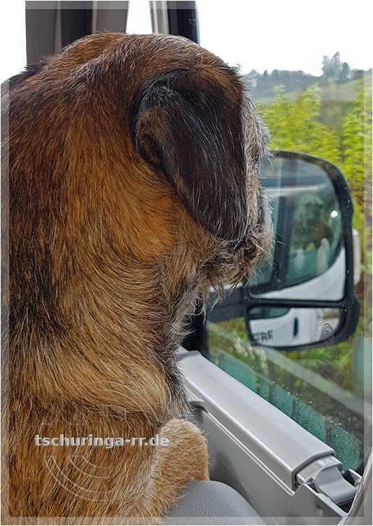 | Lennox liegt während der Fahrt zwischen den Sitzen... | Brav beim Fiatservice auf das Auto warten. | ||
