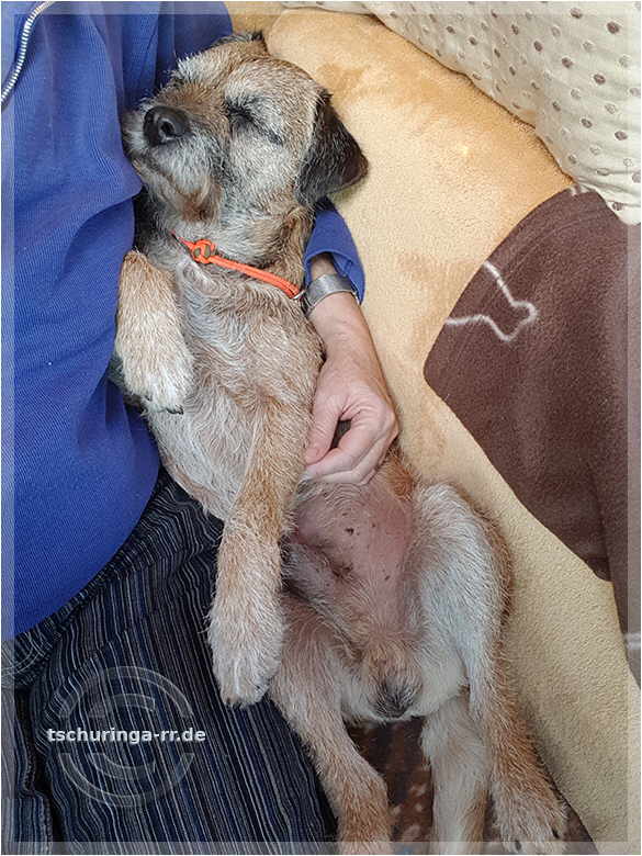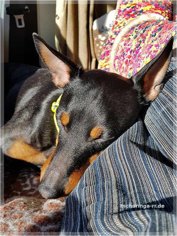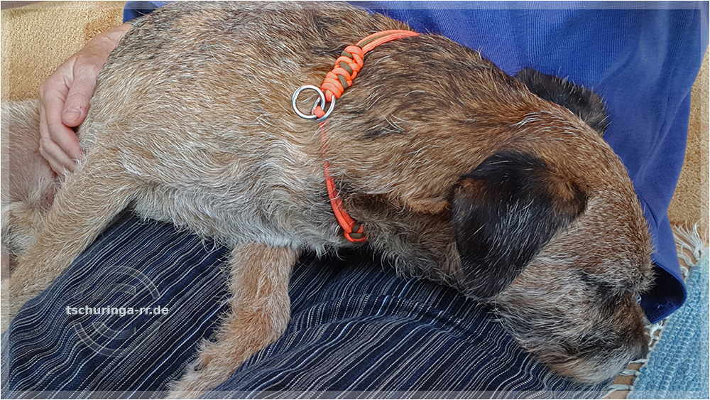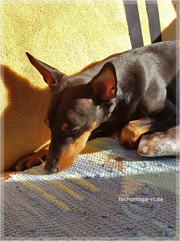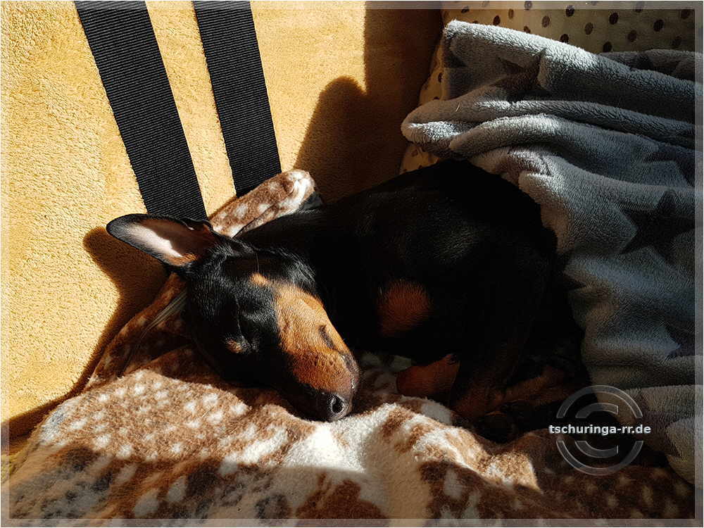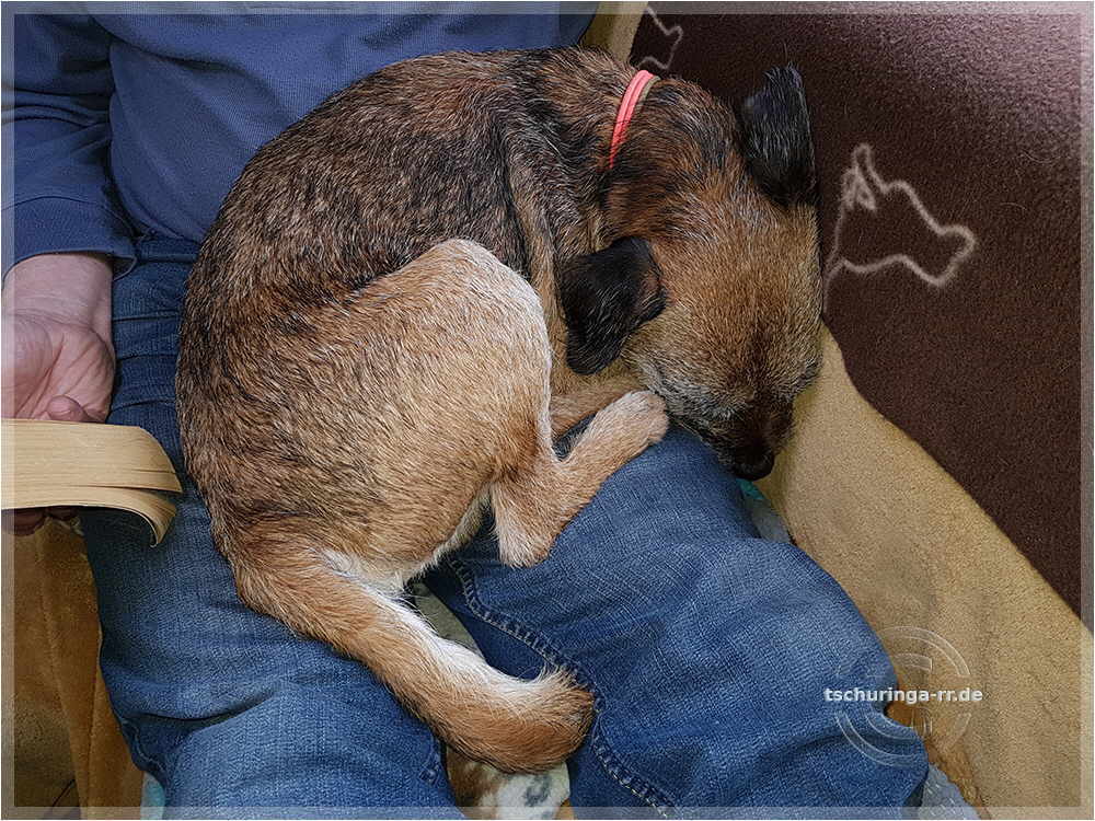 | Der einzige Sonnenplatz ist auf Herrchens Oberschenkel...