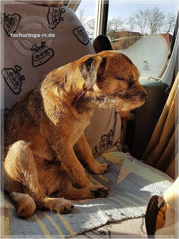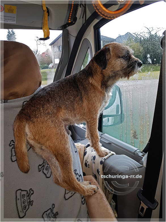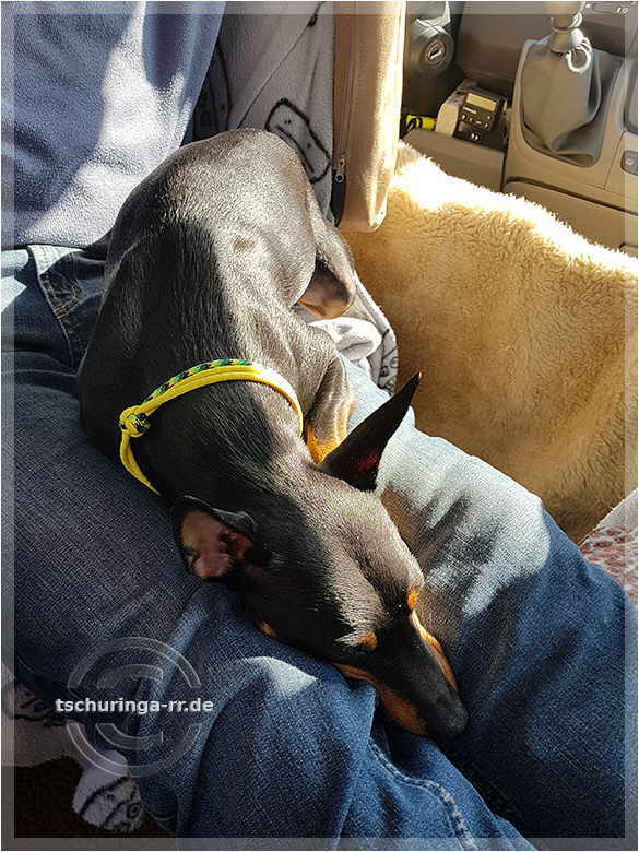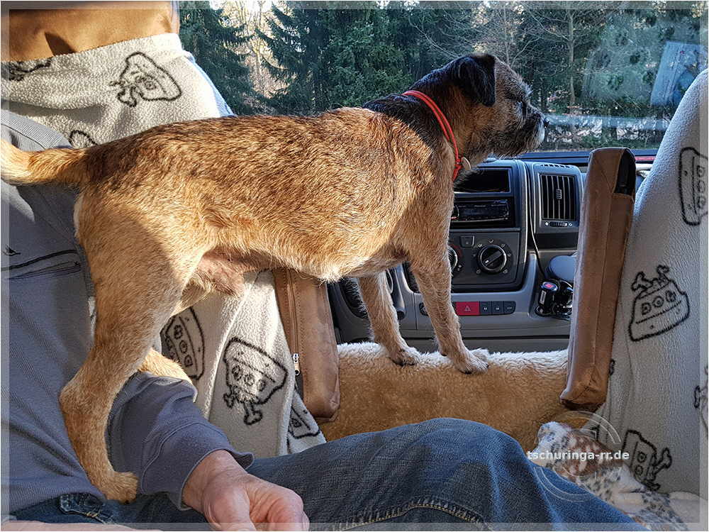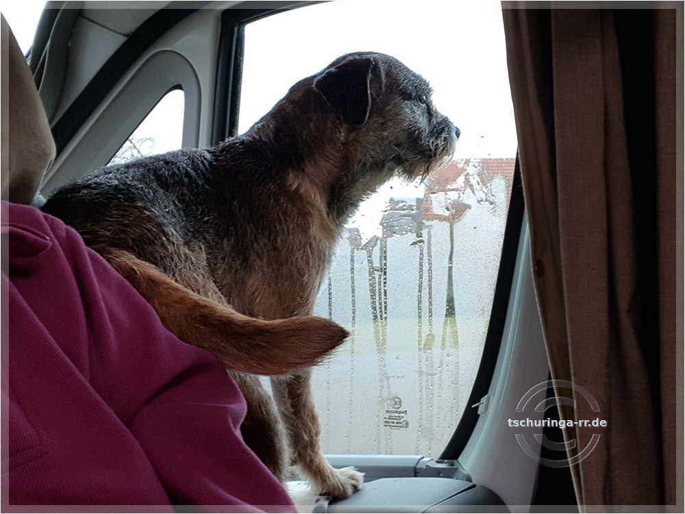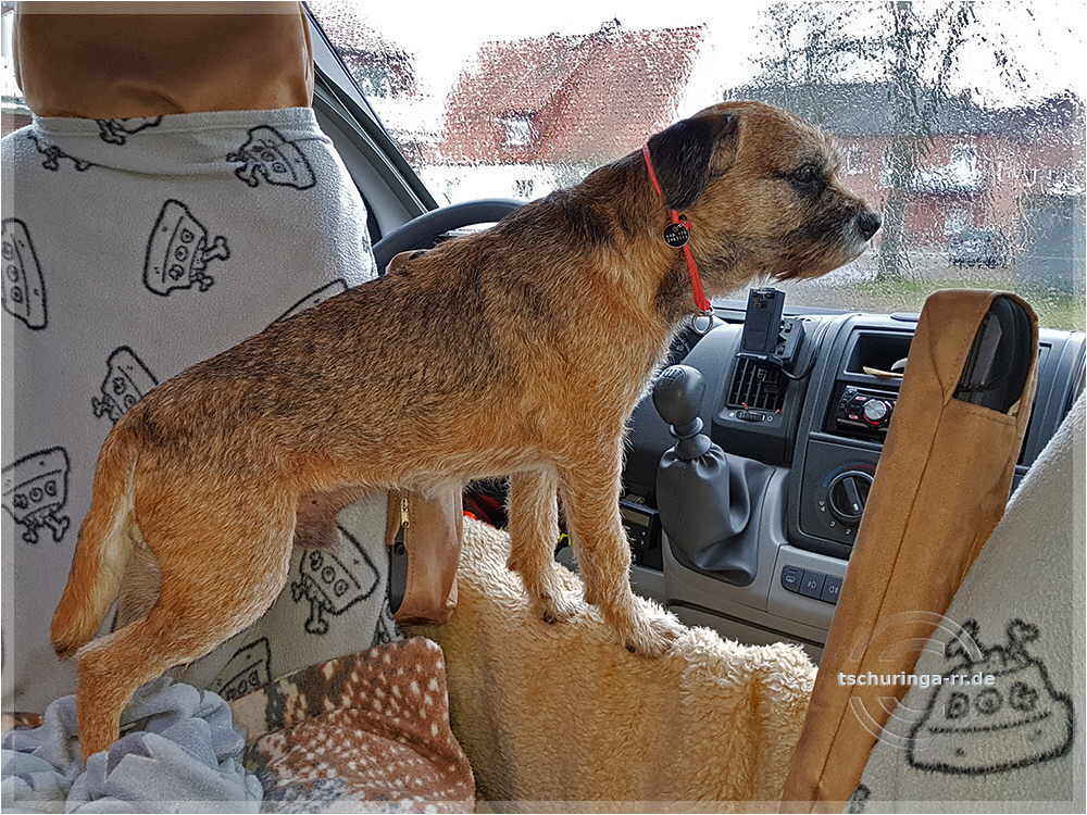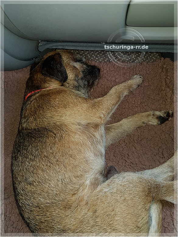 | Yukon liegt während der Fahrt beim Beifahrer. | Gehen wir nun endlich spazieren? | ||