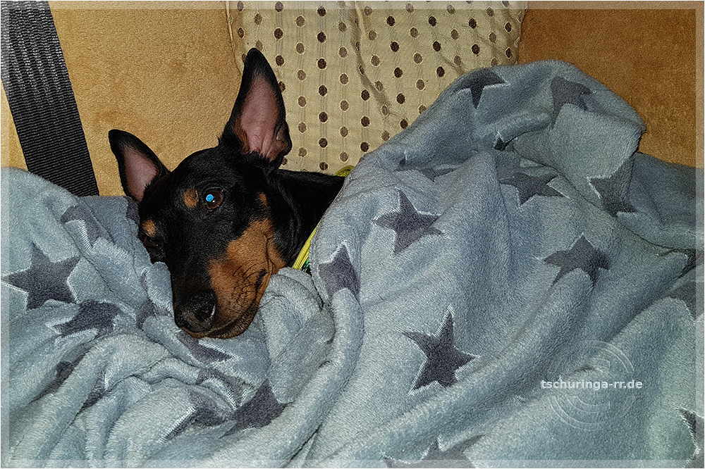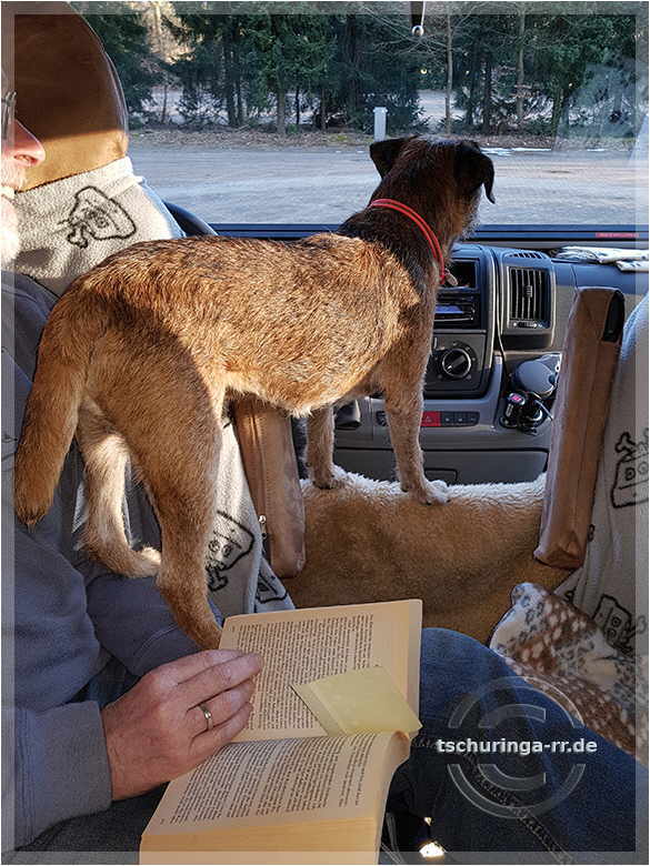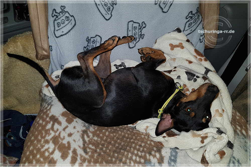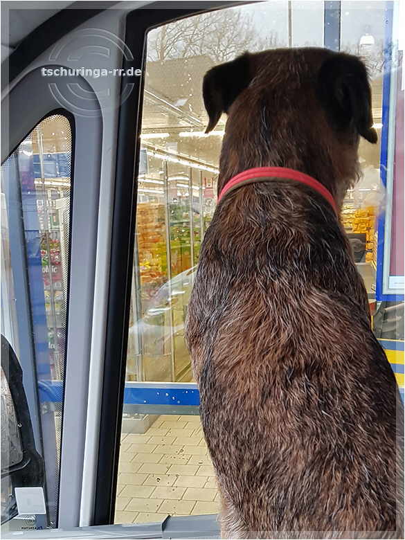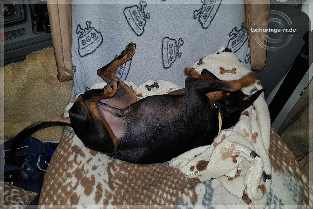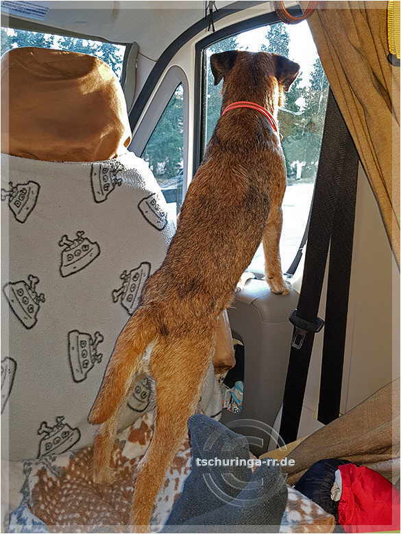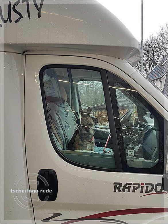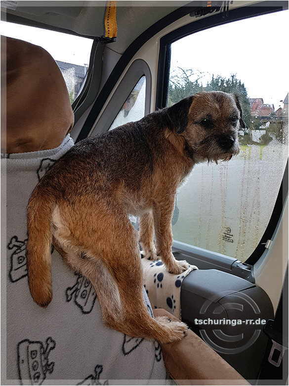 | Yukon liegt während der Fahrt beim Beifahrer. | Gehen wir nun endlich spazieren? | ||