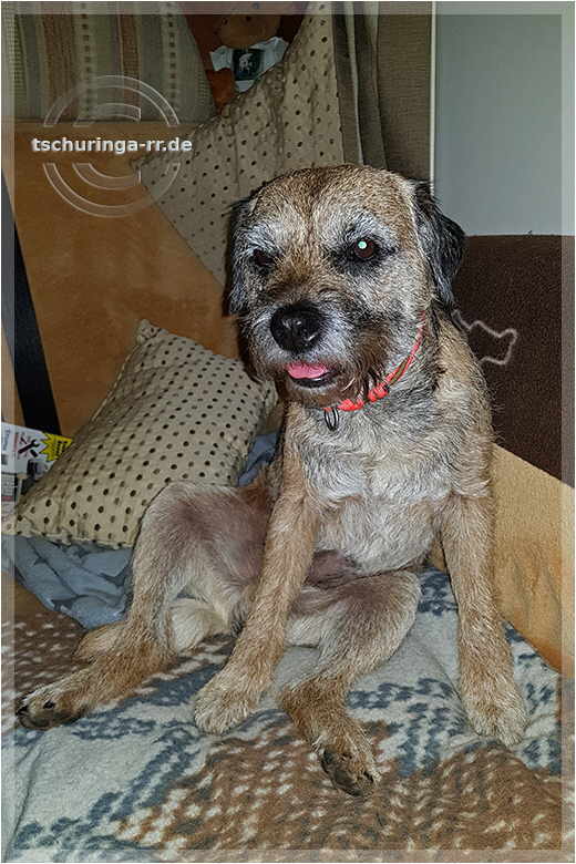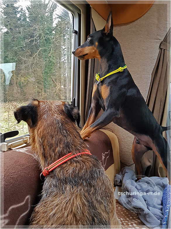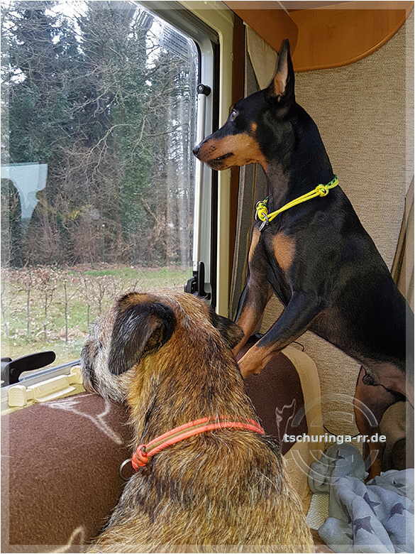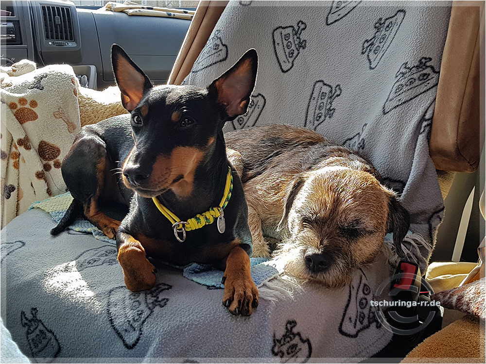 | Typisch für die Beiden. Der eine gemütlich mit dem Kopf auf der Lehne, der andere hoch aufgerichtet, damit er auch ja alles sehen kann. | |||