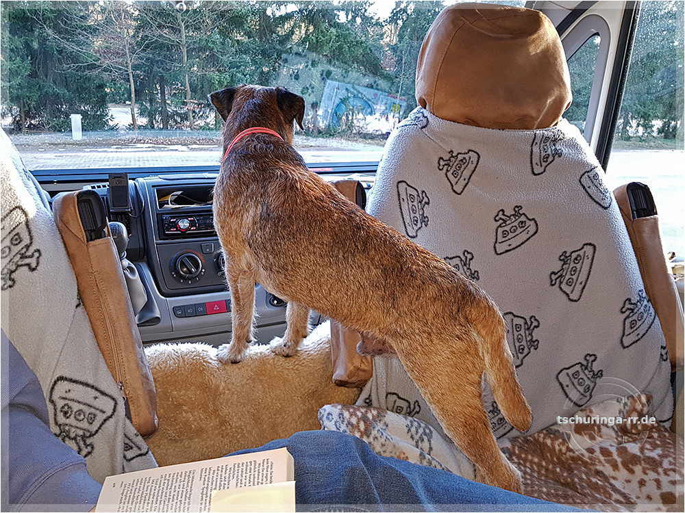 Es regnet. Aber man kann ja super im Trocknen den Stellplatz kontrollieren. |
