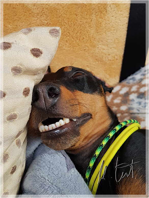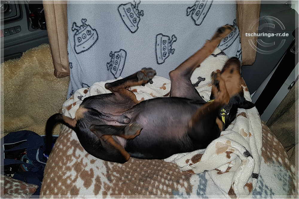 | Lennox fühlt sich sau wohl. - Rückenschubbeln auf dem Beifahrersitz | |||