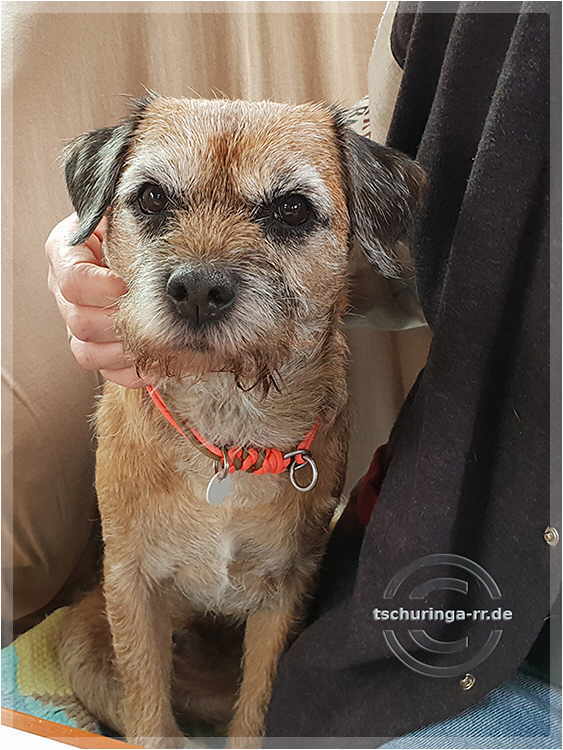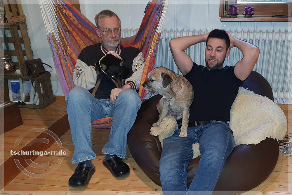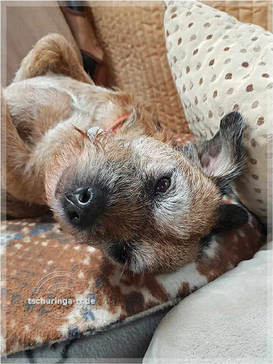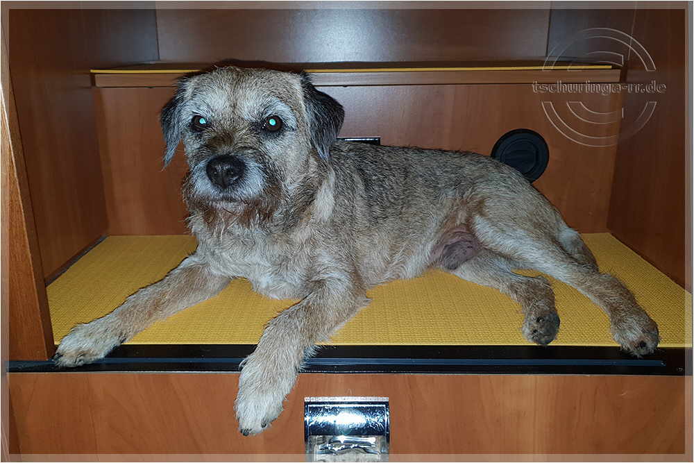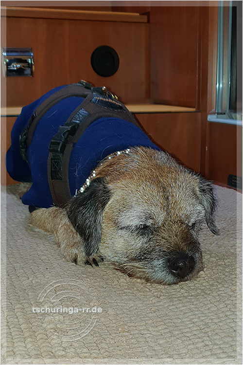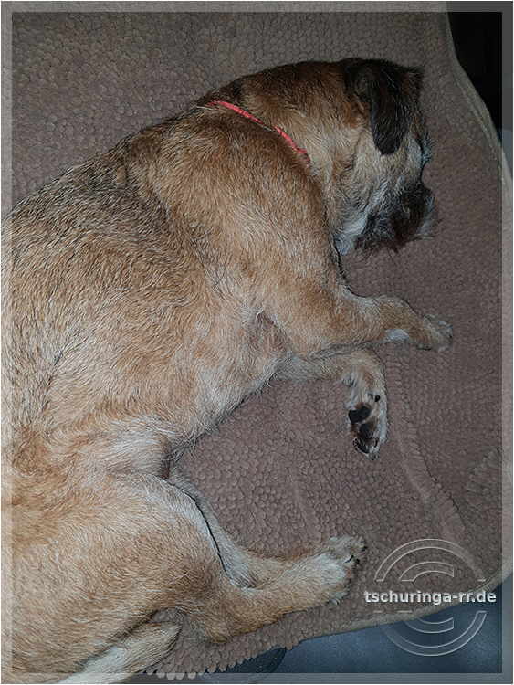 | Oh, meno, keine Fotos. Das grüne Auge war doch ein Versehen. | Lennox genießt nach der Wanderung die Ruhe bei Herrchen | ||