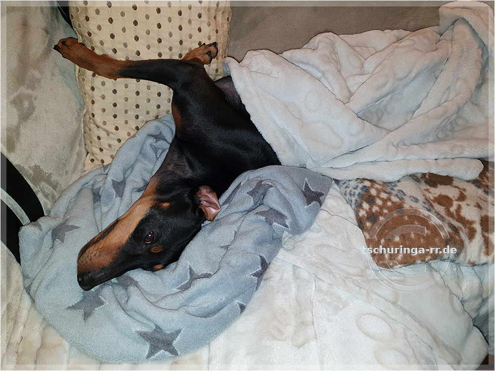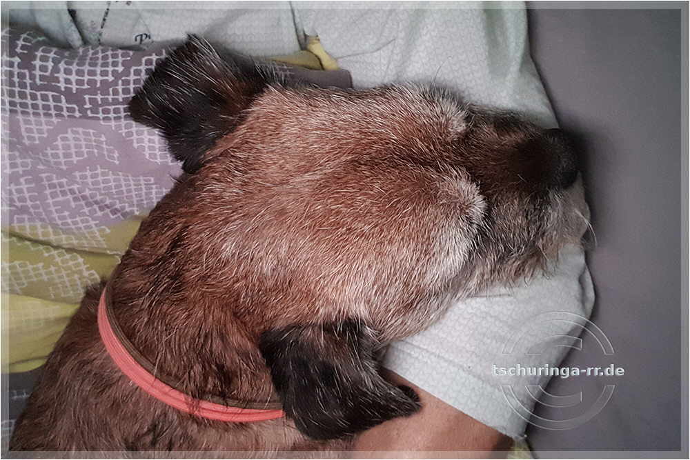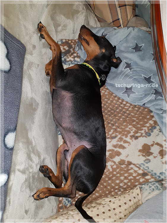 | Interessanterweise sind beide Hunde während des eigentlichen Radaus um Mitternacht völlig entspannt und schlafen. | ||