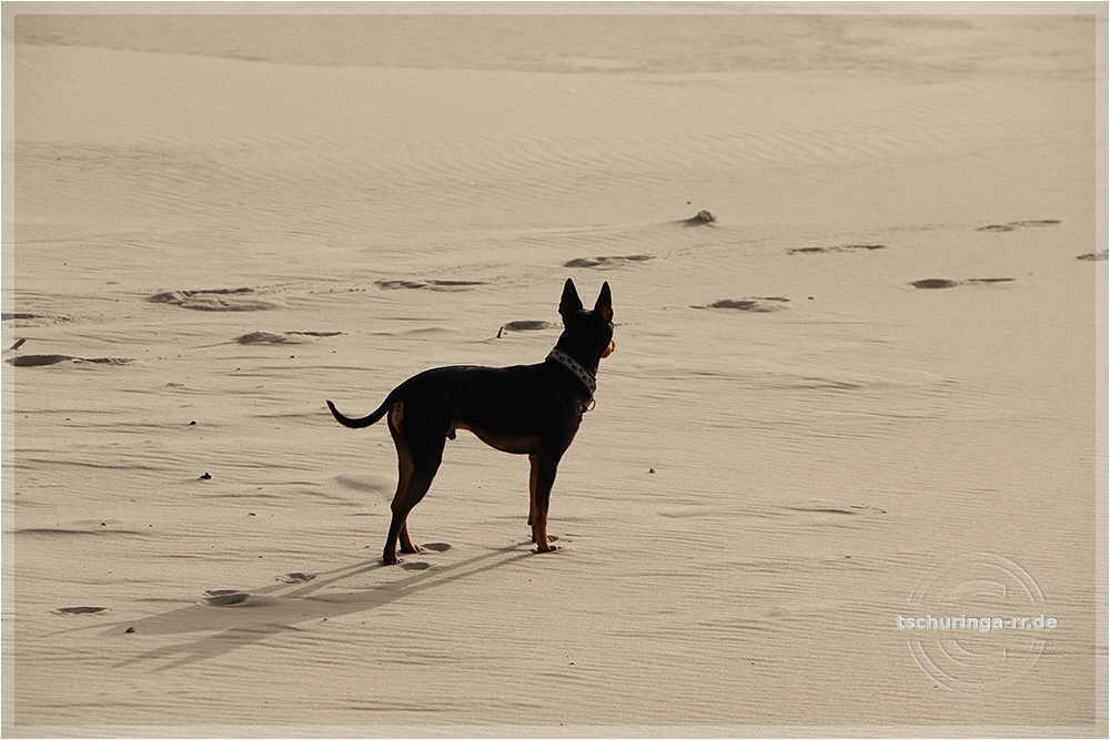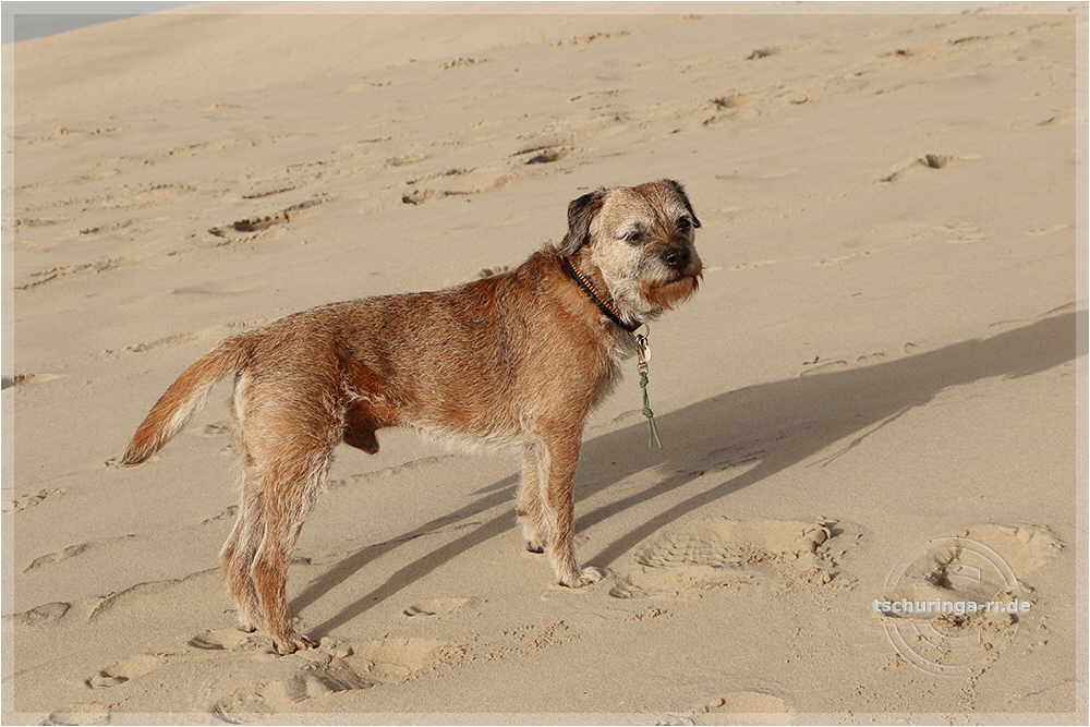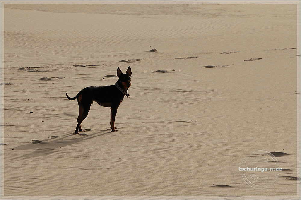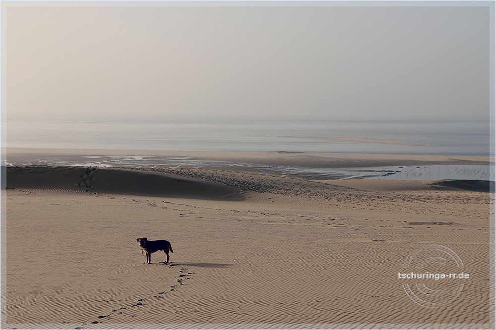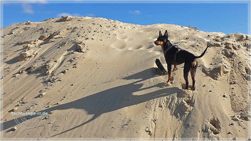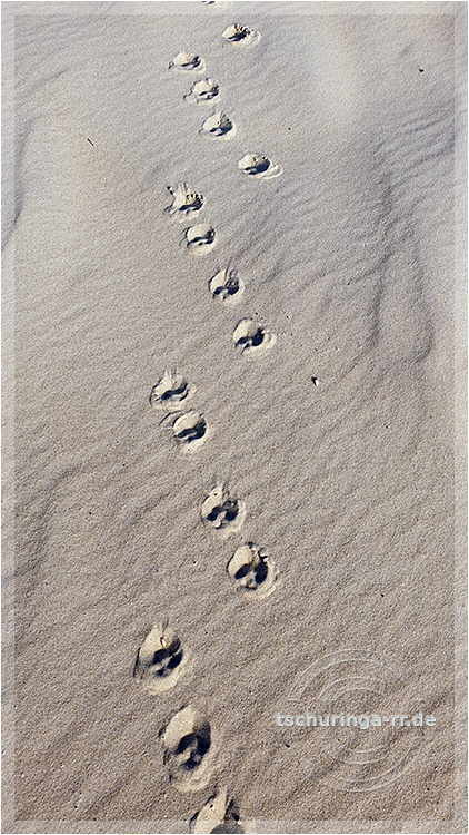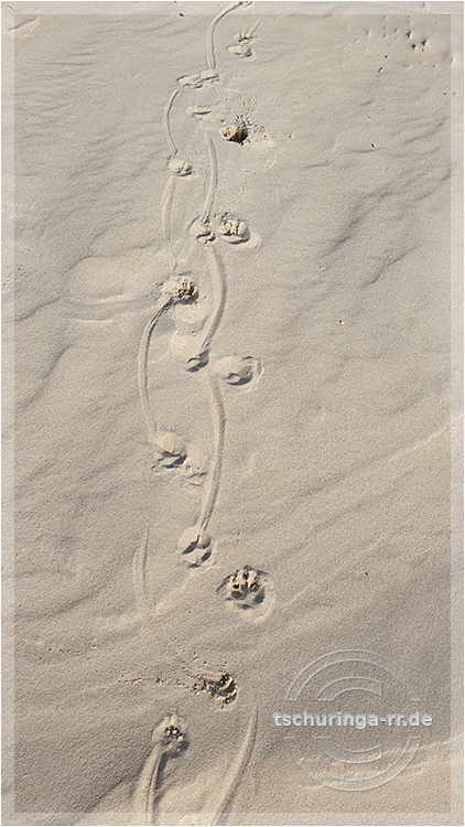 Yukons Schleifspuren im Sand. Da sieht man, dass da doch noch einiges fehlt.