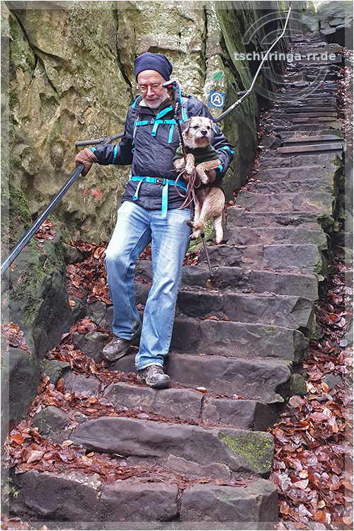Die steilen Steintreppen wird Yukon getragen. Da würde er sich die Pfoten wund scheuern.