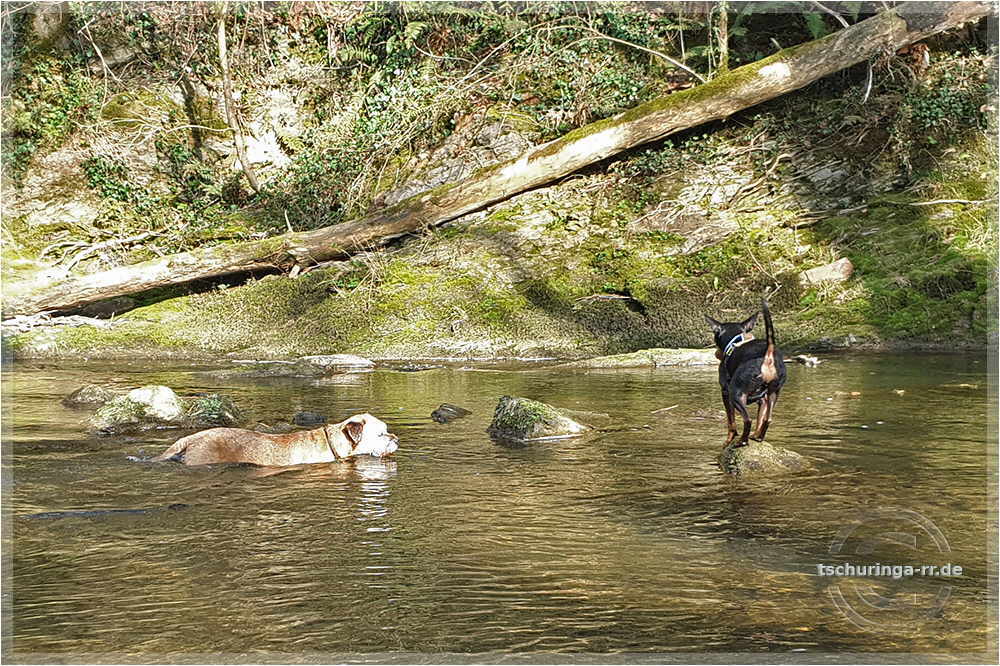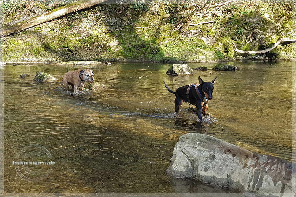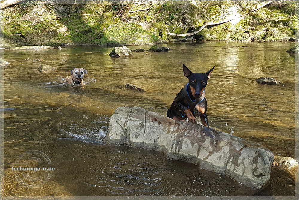 Während Yukon fast bis zu den Ohren im Wasser steht, balanciert Lennox auf dem Stein,