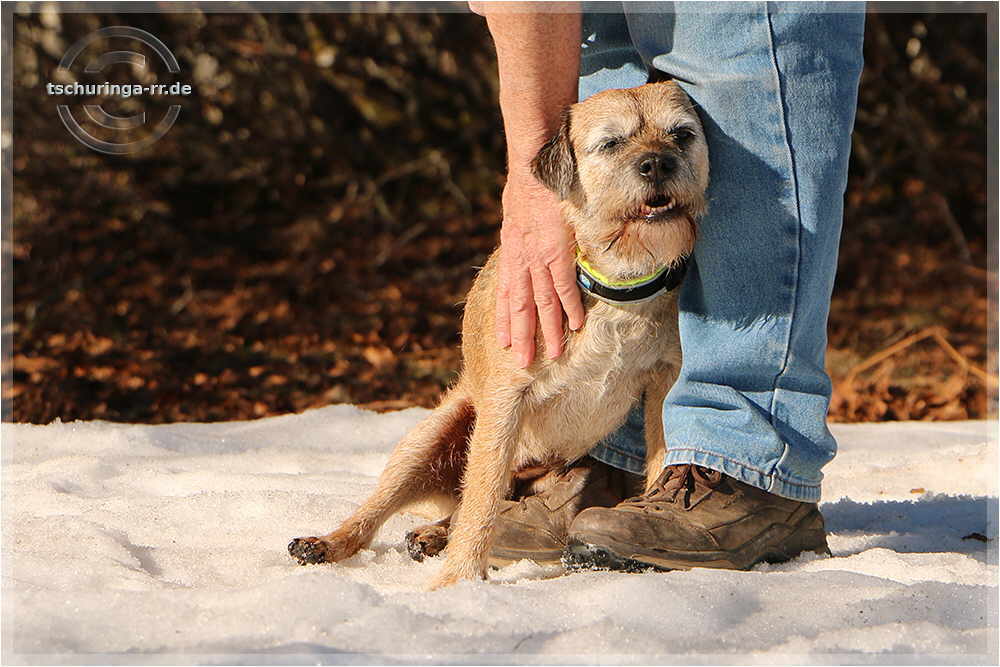 Mit Herrchen kuscheln ist schön. Da hält er ganz still, der kleine Genießer.