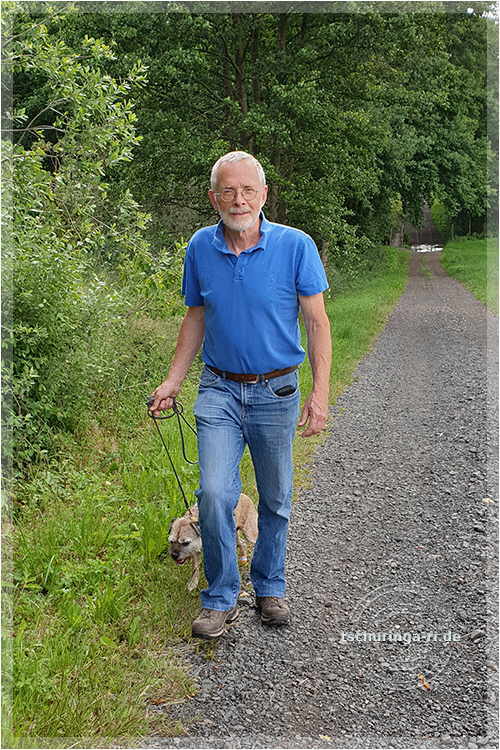 Erste kleine Wanderung nach dem Neustart. Leider sind hier viele Wege mit Schotter. So muss Yukon an der Leine neben dem Weg geführt werden, damit der sich die Pfoten nicht blutig läuft. |