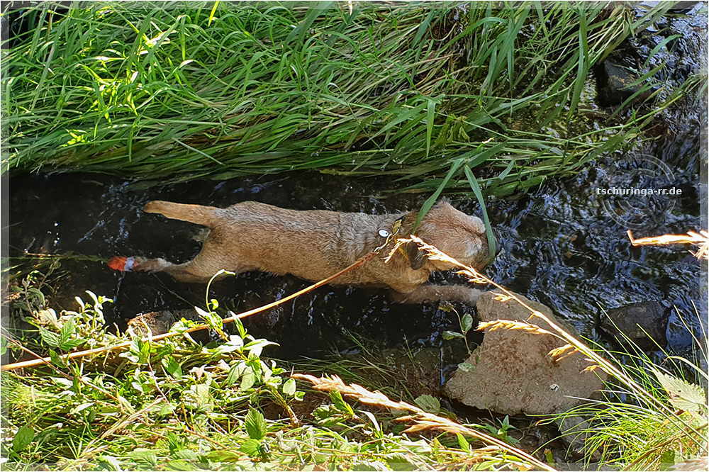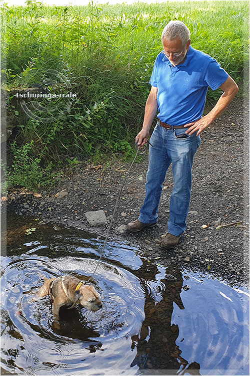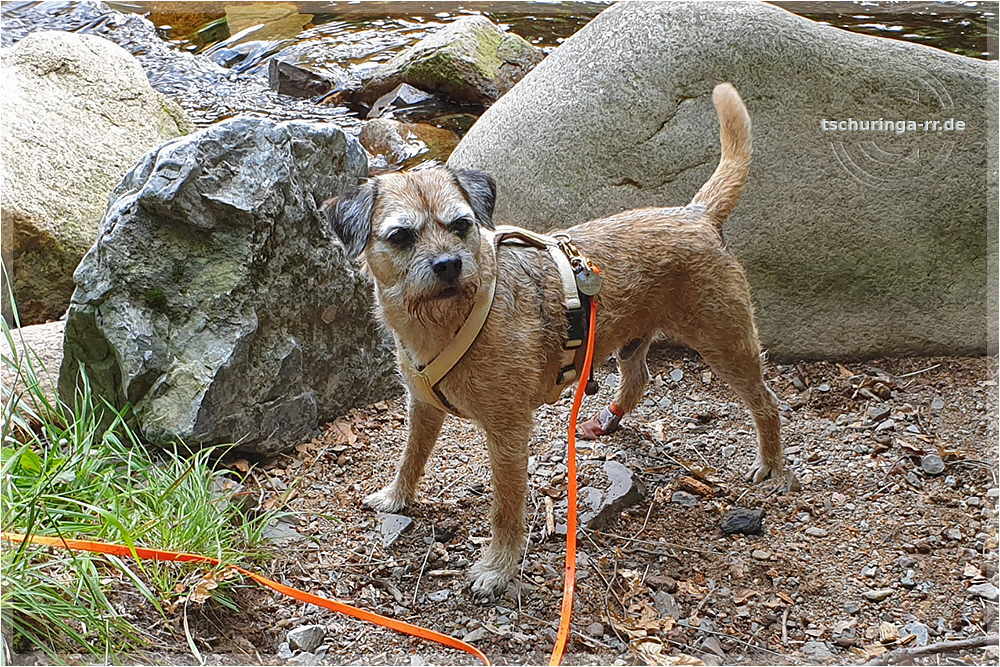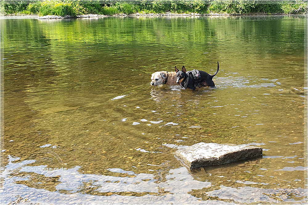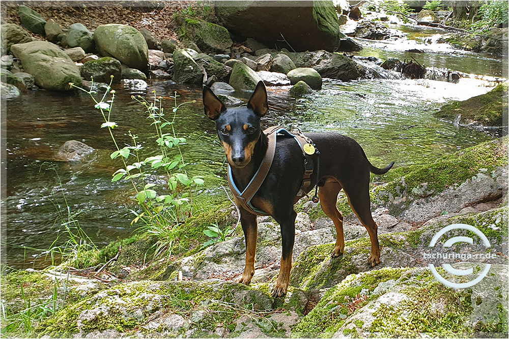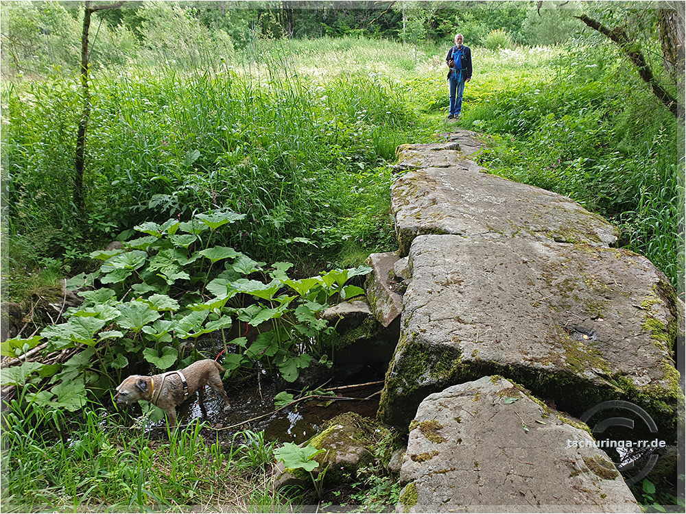 Magistersteg, Basaltplatten über den Wannbach. Yukon geht lieber drunter durch. Da ist es schön kühl. |