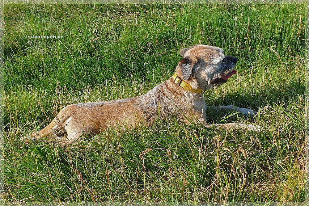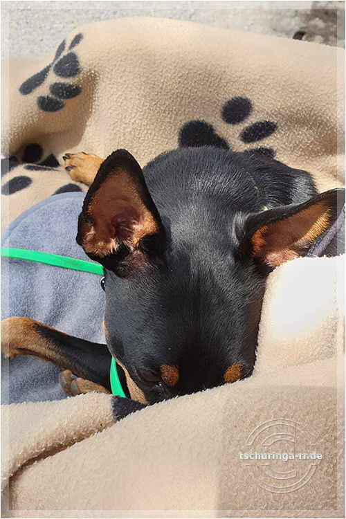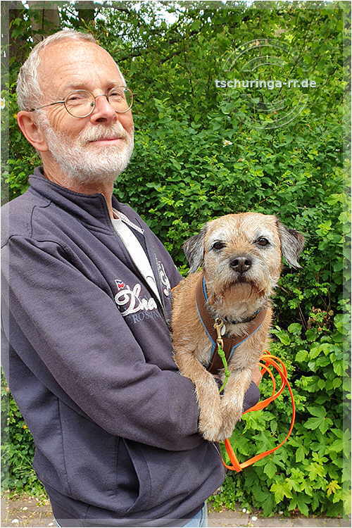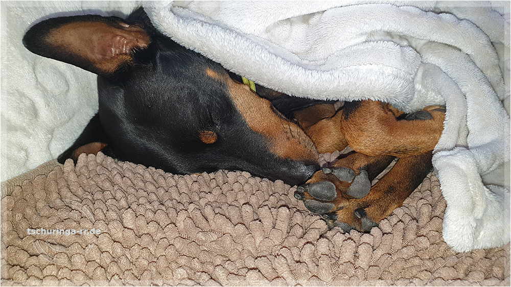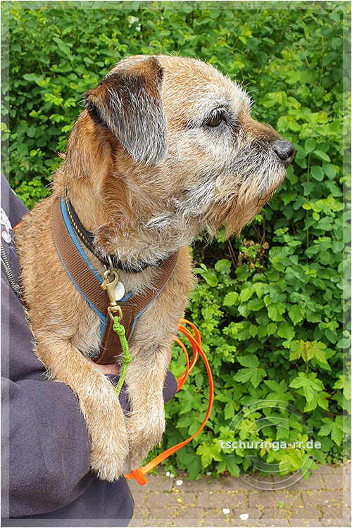 Er llaeuft inzwischen wieder recht gut mit. Schuhe braucht er aber noch, weil er sich sonst die Pfoten aufscheuert, denn er schleift noch ordentlich damit ueberber den Boden. |