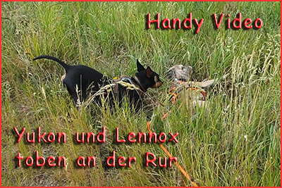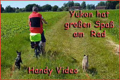 Heute ist eine Radtour vom Stellplatz aus angesagt. Friedbert hat eine Strecke rausgesucht, auf der es immer wieder mal Gelegenheit für Yukon gibt, frei am Rad zu laufen. Der Bub ist heute super drauf und sprintet beim ersten Freilauf nach vorne und fordert mich mit dem ihm ganz typischen Blick zum "Schneller" auf. Mit vielen Pausen läuft er heute fast 4,5 km mit einem Tempo zwischen 9 und 11 km/h. Lennox läuft insgesamt 8,5 km. Leider haben wir einen von Yukons Schuhen verloren und obwohl wir noch zurück fahren, bleibt er verschwunden. |