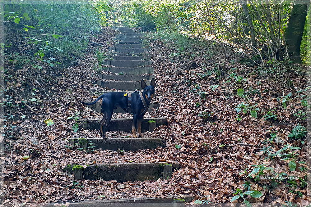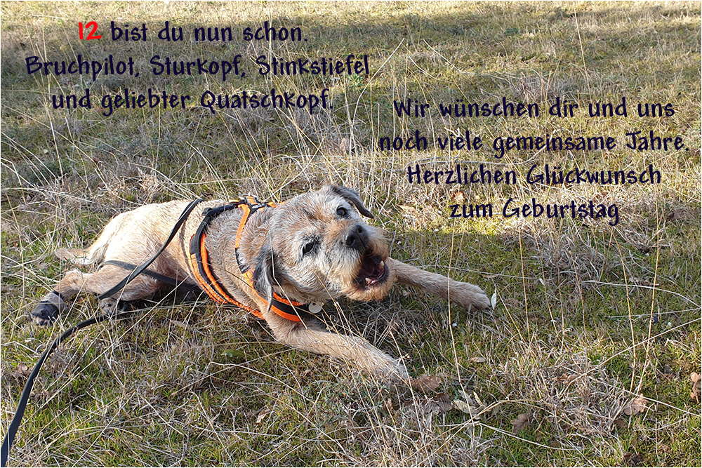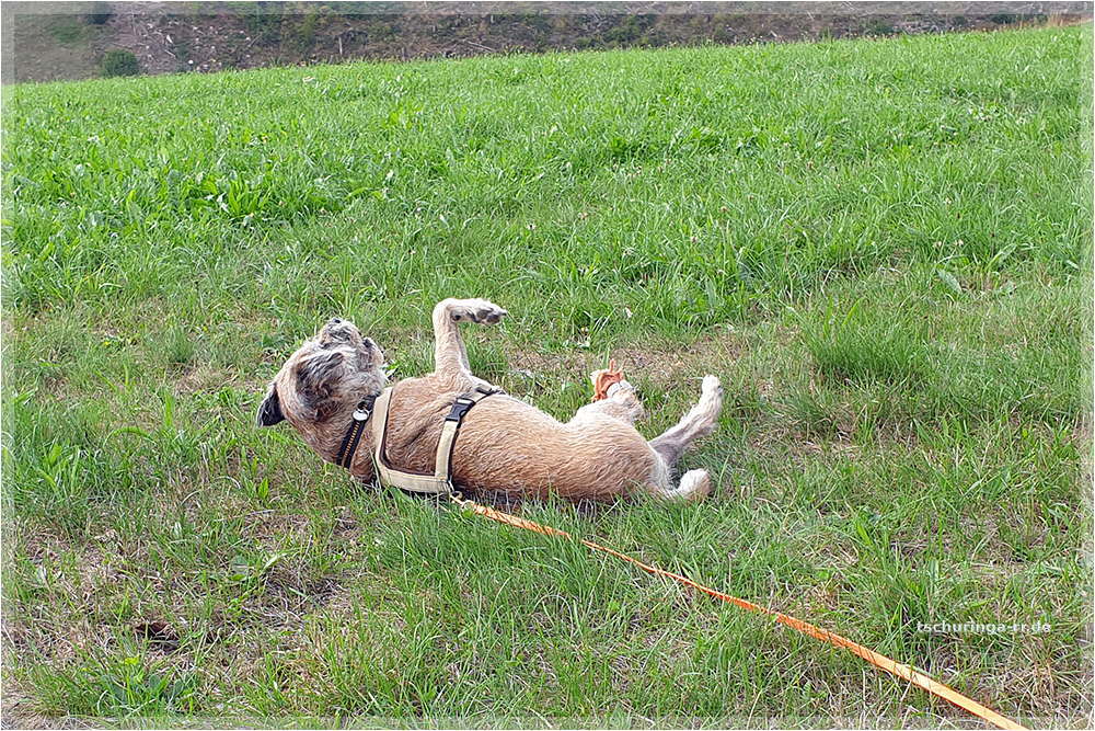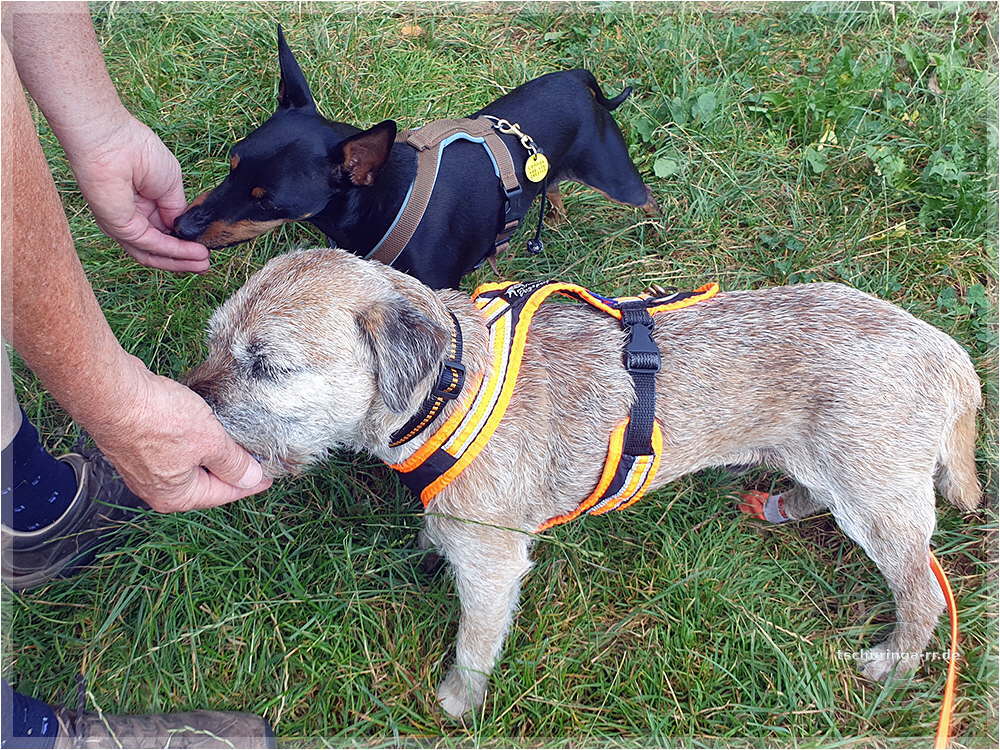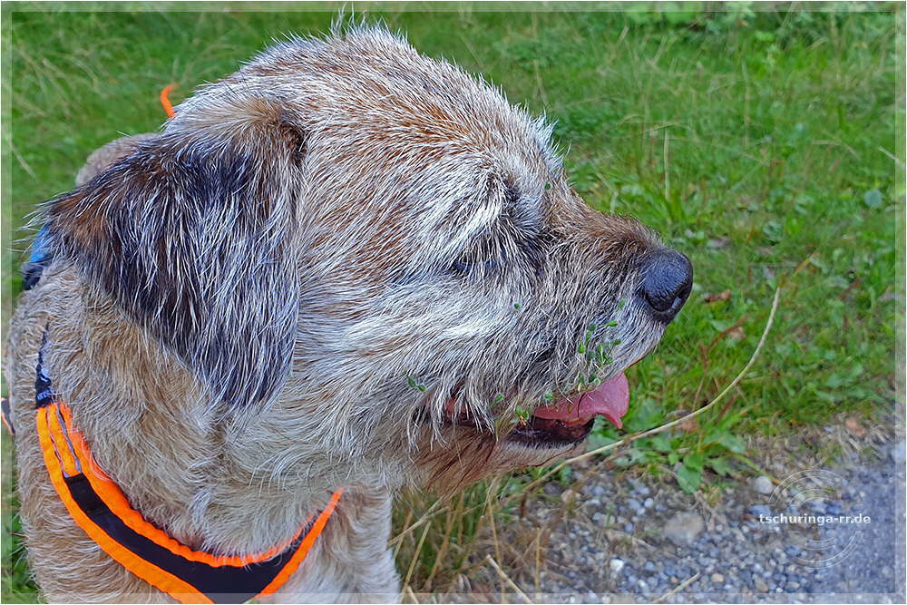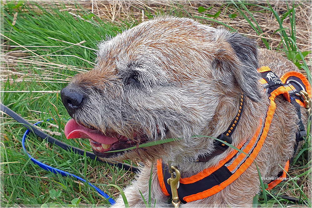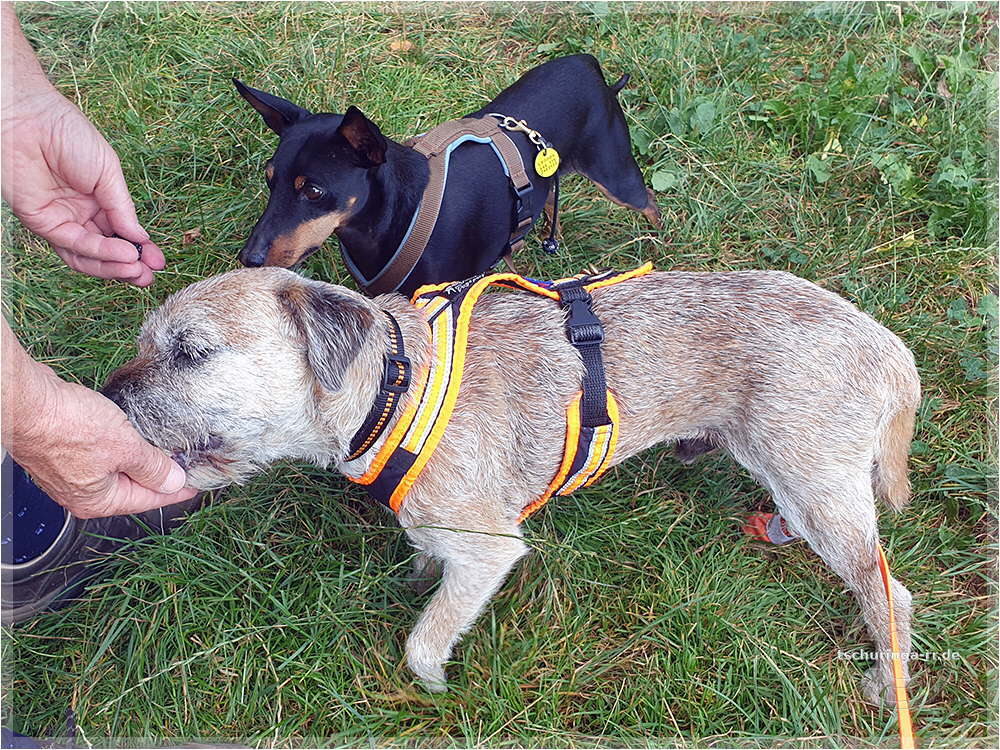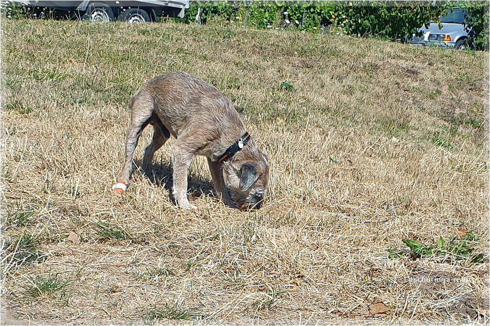 Er läuft inzwischen wieder recht gut mit. Schuhe braucht er aber noch, weil er sich sonst die Pfoten aufscheuert, denn er schleift noch ordentlich damit über den Boden. |