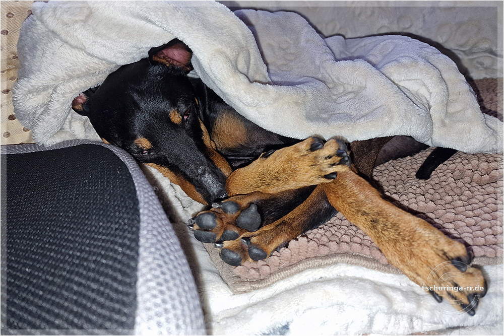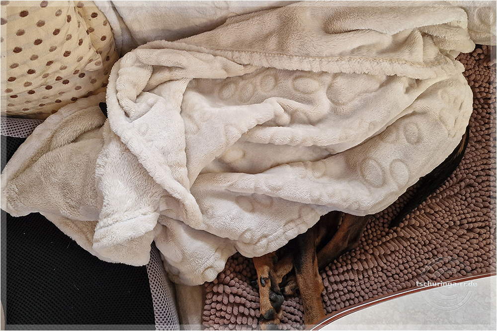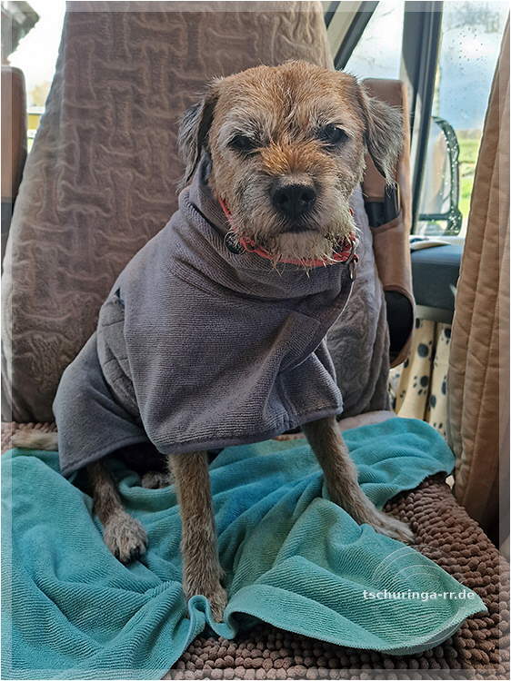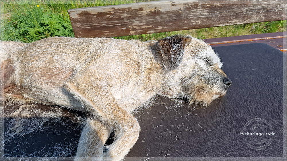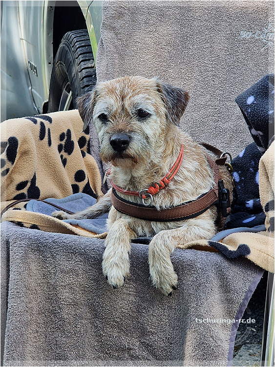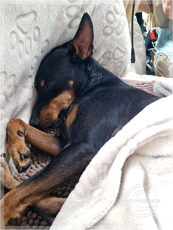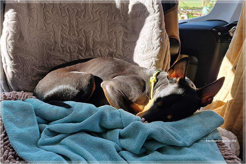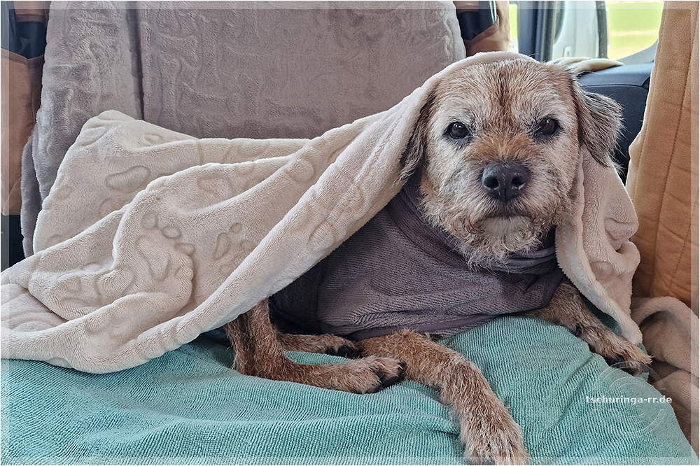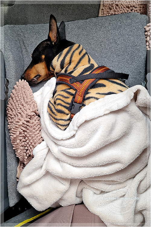 Mittagspause auf dem Anhänger und unter Herrchens Jacke |