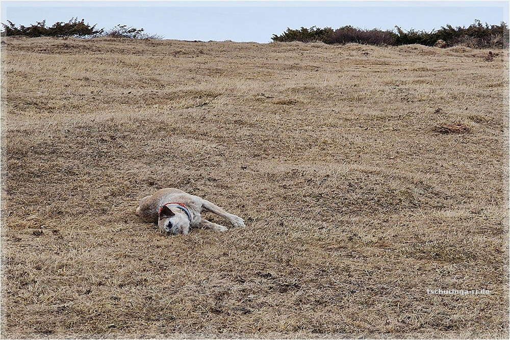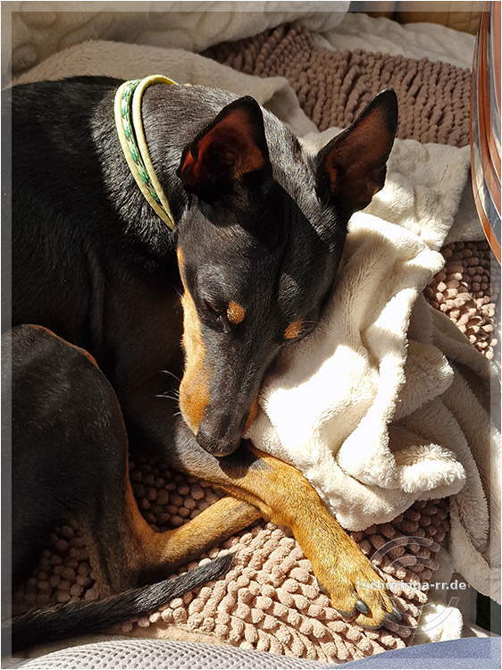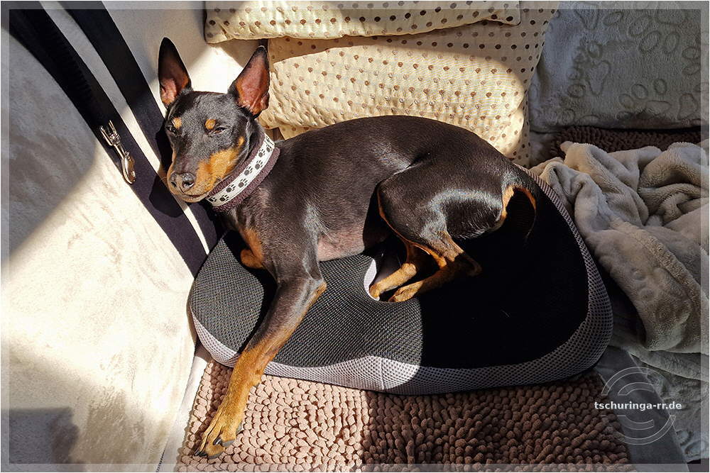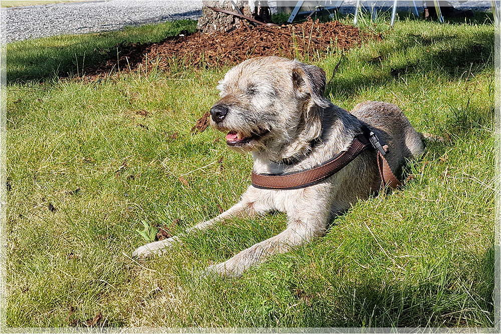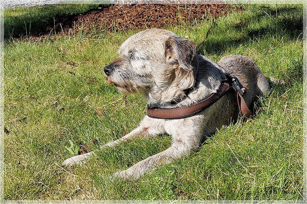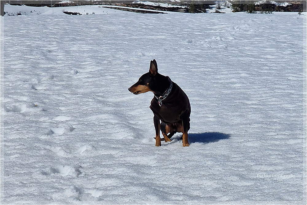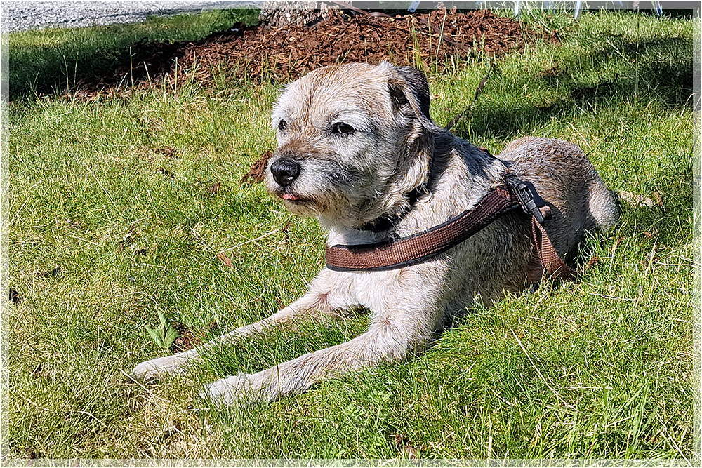 Das ist nach Lennox Geschmack. Sonnig, windstill und noch einen kuscheligen Mantel an. |