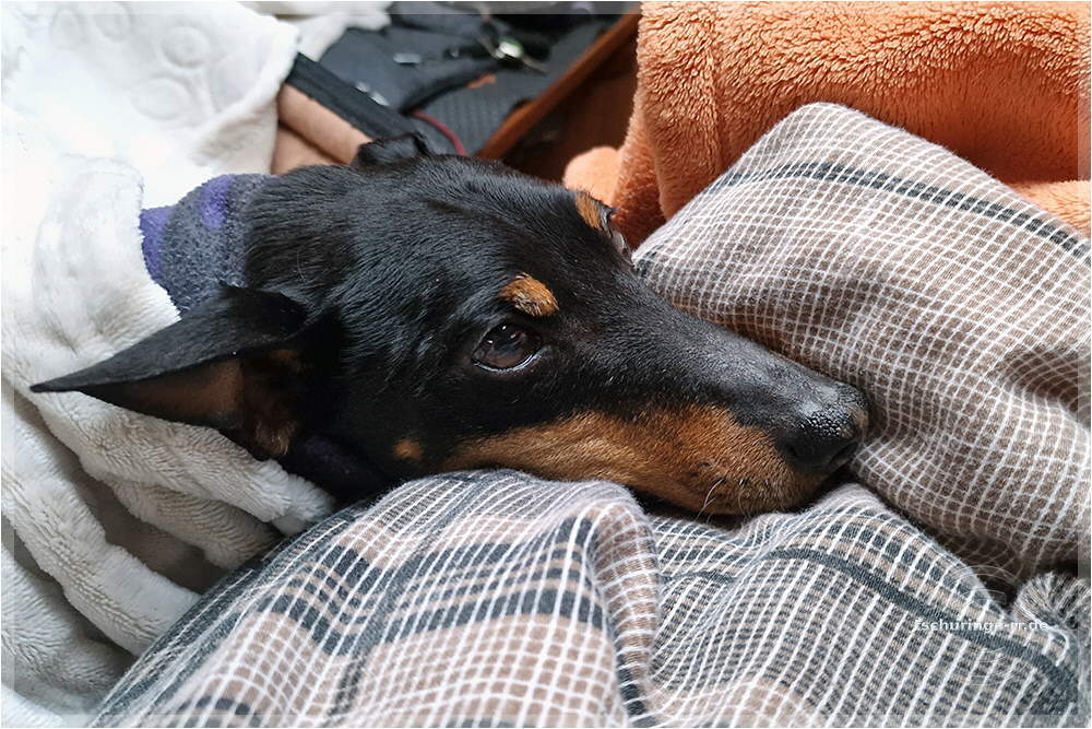 Lennox schmollt. Es gab Ärger mit Frauchen, weil er auf Yukon losgegangen ist. |