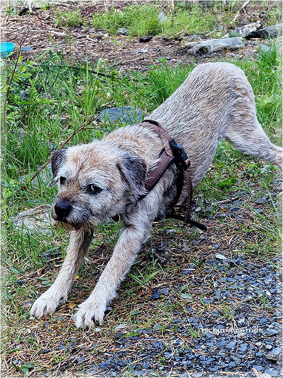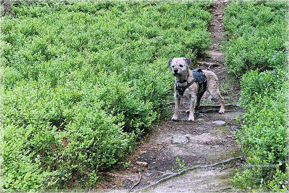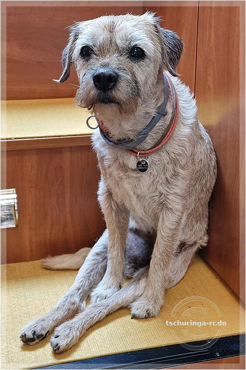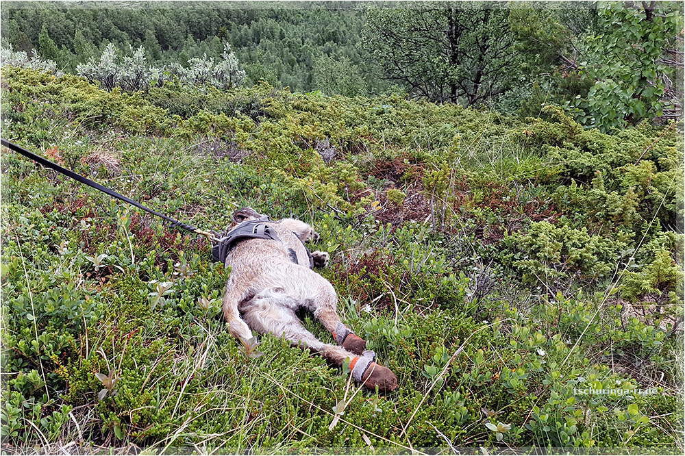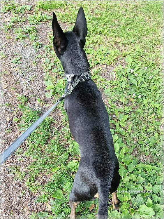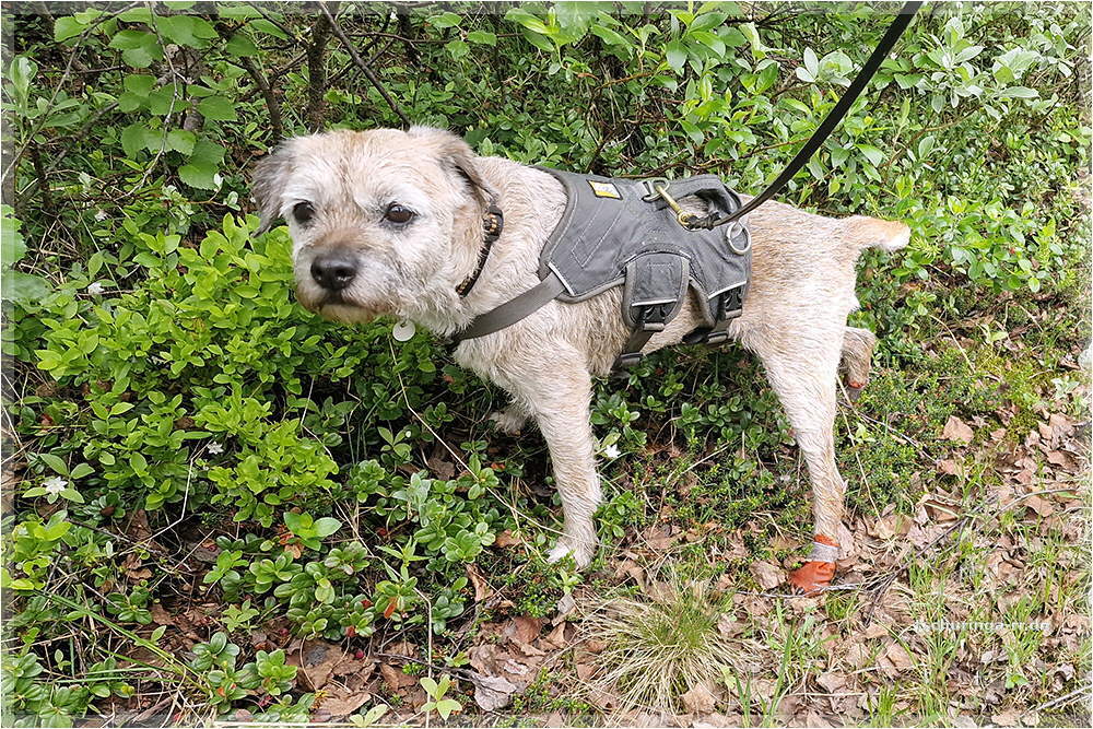 Er läuft inzwischen wieder recht gut mit. Schuhe braucht er aber noch, weil er sich sonst die Pfoten aufscheuert, denn er schleift noch ordentlich damit über den Boden. |