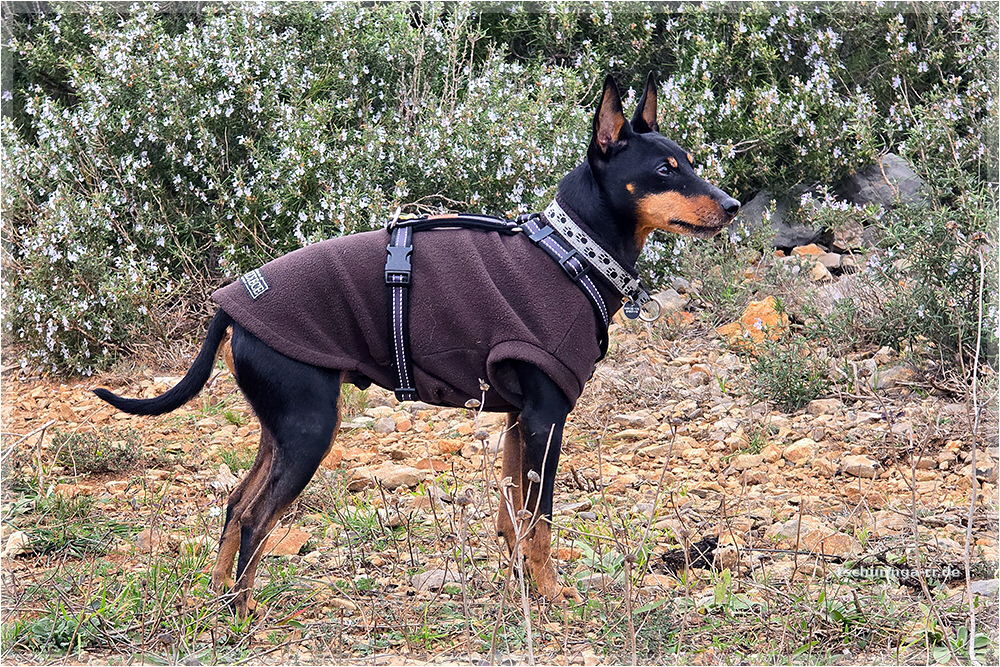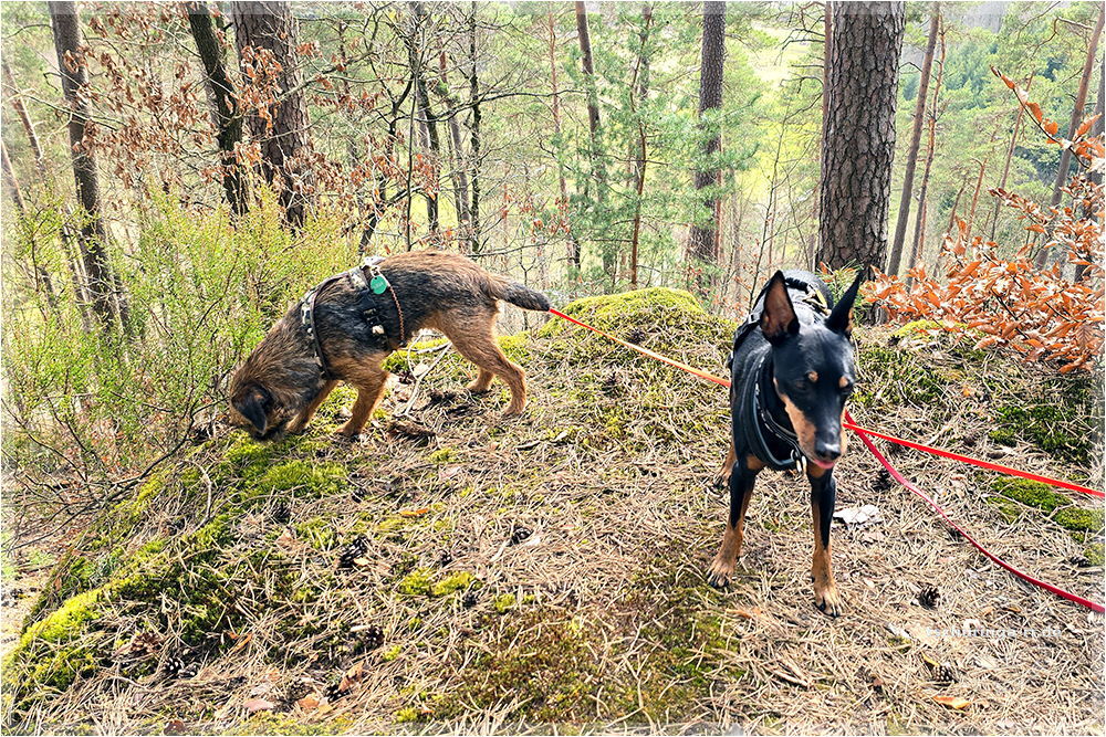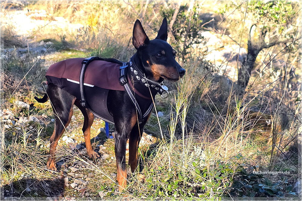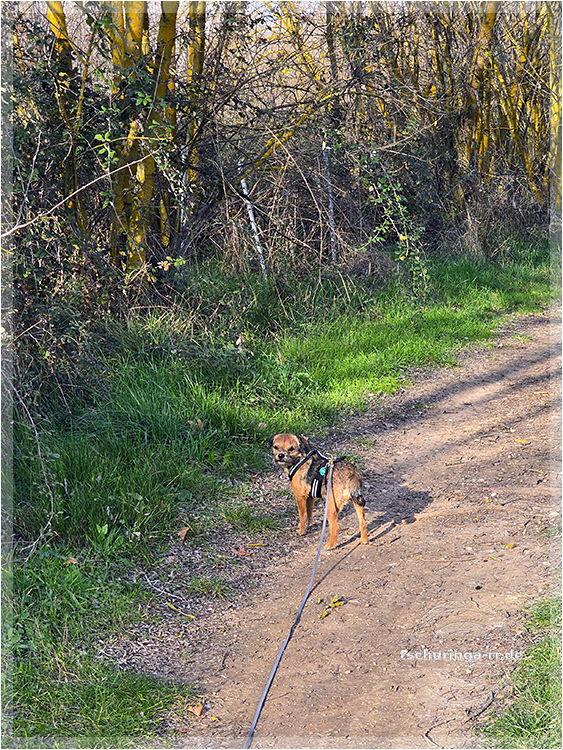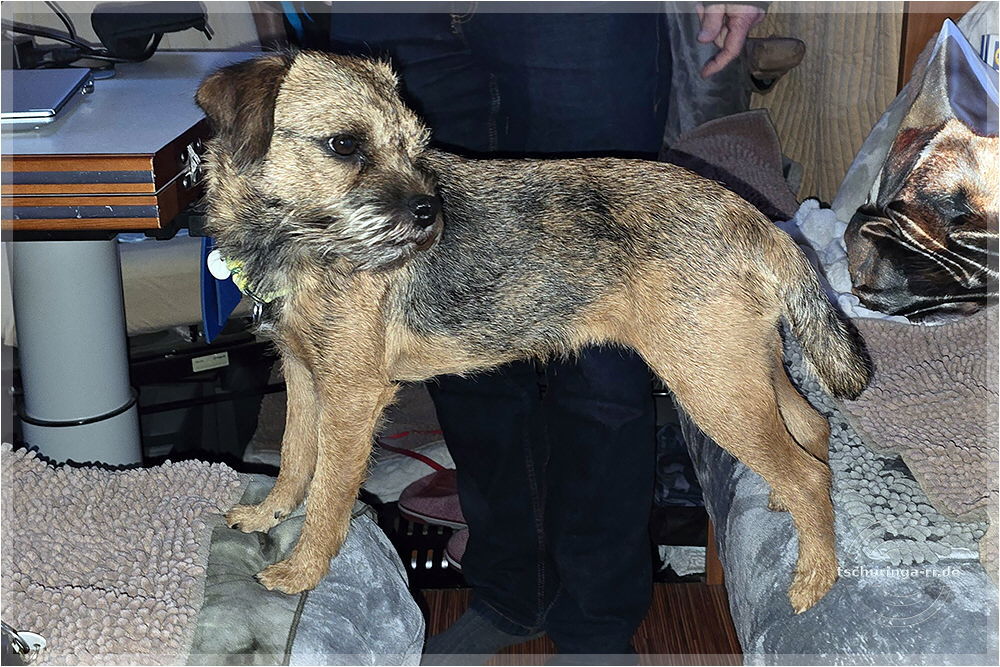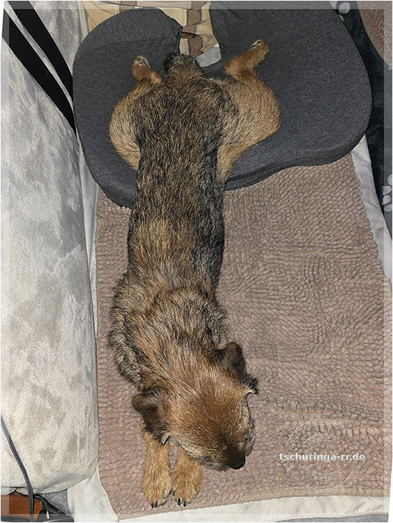 Er läuft inzwischen wieder recht gut mit. Schuhe braucht er aber noch, weil er sich sonst die Pfoten aufscheuert, denn er schleift noch ordentlich damit über den Boden. |