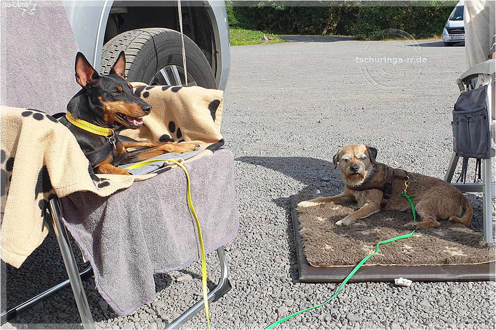 Vor der Abfahrt gehen wir mit ihm noch mal auf der Wiese neben dem Wohnmobil. Das geht nur zu zweit. Einer hält Yukon, der andere den Urinbeutel. Gut, dass so früh noch nicht viel los ist. . Nach dem Frühstück geht es dann Richtung Heimat. Während der Fahrt liegt Yukon auf einem gut abgepolsterten Platz zwischen Fahrersitz und Tisch. Er schläft die meiste Zeit. In der Mittagspause bringen wir ihn noch mal auf die Wiese, in der Hoffnung, dass er Kot absetzen kann, denn das letzte Häufchen liegt jetzt doch drei Tage zurück. Das klappt dann auch. Auf der Weiterfahrt schläft er tief und fest, denn er ist völlig platt. Häufchen machen und Rumgucken waren doch sehr angstrengend. Ich telefoniere noch lange mit der Physiotherapeutin, die uns Hoffnung macht, dass sie den Buben wieder auf die Pfoten bekommt. Das was ich ihr zum dem Verlauf schildern konnte, bewertet sie sehr positiv. Ich hoffe stark, dass sie Recht behält. |