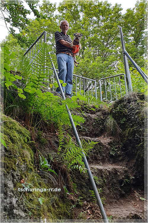 56 Stufen rauf und 56 Stufen runter. Vorsichtshalber gegen Absturz gesichert, schafft Yukon die fast allein. |