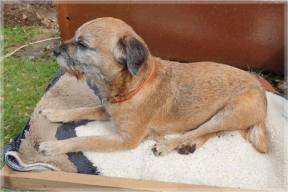 | Gartenarbeit ist angesagt. Herrchen hat ein Notlager gemacht, damit Yukon bei uns sein kann | ||