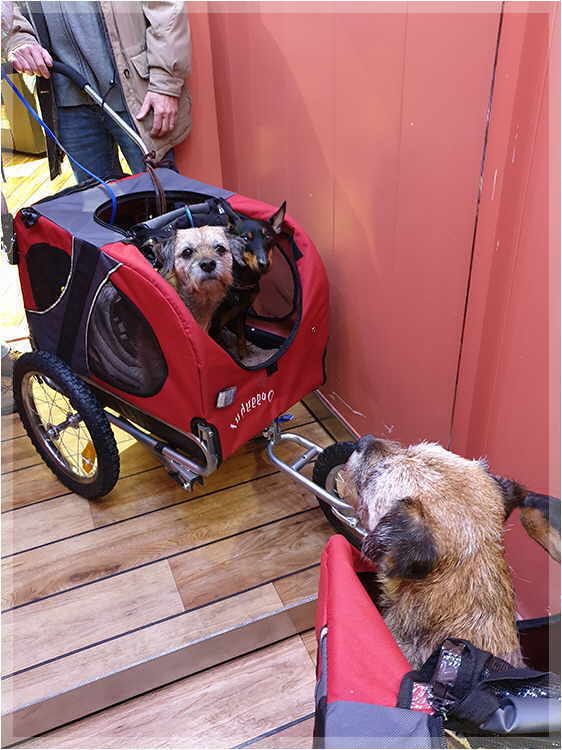 Durch regelmäßige Physiotherapie und viel Training zuhause und auf Spaziergängen, auf denen wir immer mit ihm querWALDein gehen, damit er möglichst viel unwegsamen Untergrund hat, ist Yukon Anfang Juni soweit, dass wir die Tour nach Norwegen wagen können. Ausgerüstet mit diversen Schuhen und einem neuen Ruffwear Webmaster Harness Geschirr, um ihn damit besser führen und auch sichern zu können, starten wir endlich. Das Geschirr ist eine ausgesprochen gute Investition. Ohne das und die ständige Sicherung mit der Leine wäre Yukon im teilweise sehr unwegsamen Gelände in Norwegen mehr als einmal in den Tod gestürzt. Aber Herrchen hat ihn gut gesichert und so übersteht der Bub alles unbeschadet. Natürlich steht die gesamte Tour im Zeichen von Yukons Gesundheitszustand und Leistungsfähigkeit. So haben wir einige Hilfmittel mit. Zum einen das bereits erwähnte Geschirr, einen Hunderucksack, den Fahrradanhänger und für das Training auch noch Physiobänder, mit denen wir allerdings nicht so gut zurecht und die deshalb nur gelegentlich in den Einsatz gekommen sind. |