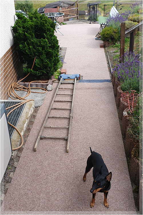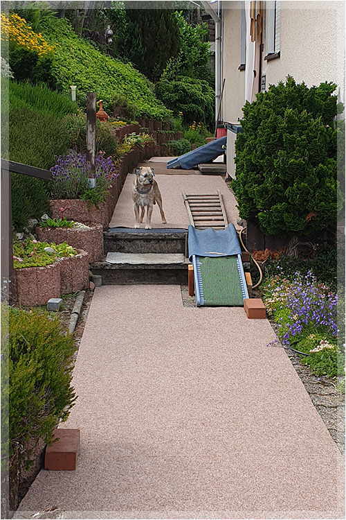 Die Stufen auf der Terrasse und ins Haus sind natürlich mit Rampen versehen, die unser Humpelchen auch brav nutzt. |